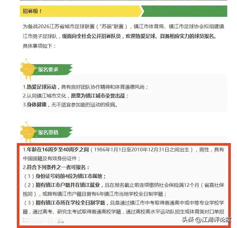 想不到吧?苏超2026赛季球员政策会有大调整。 近日,镇江发布招募2026年苏