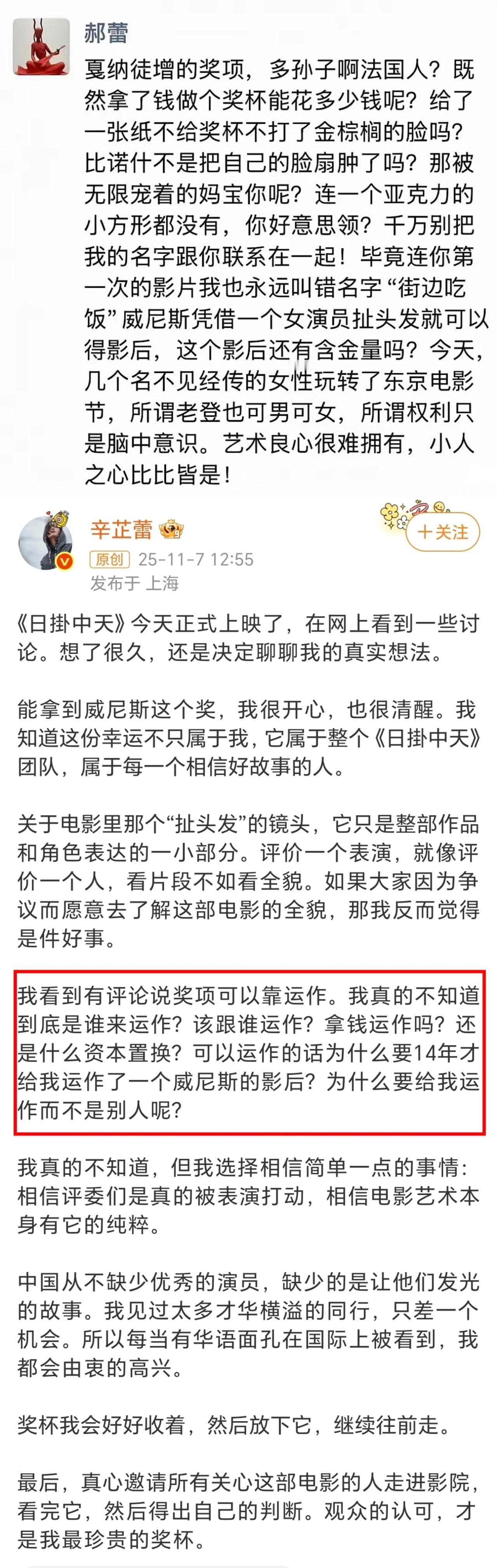 力挺辛芷蕾回应威尼斯获奖争议!郝蕾真的有点“飘”了! 郝蕾演技不错,但出道近三十年大奖影后挂零,多少有点“酸葡萄”心理。 近几年,她也鲜有佳作问世,却在表演导师席上混的风生水起。凭借犀利的点评风格和反对流量至上的观点,成为众人尊敬的表演名师。 但是,疑似郝蕾朋友圈的发文,没有确凿事实根据的炮轰《狂野时代》、辛芷蕾等获奖有黑幕,确实不负责任,也有失风度。 这一次,大家站谁呢?
