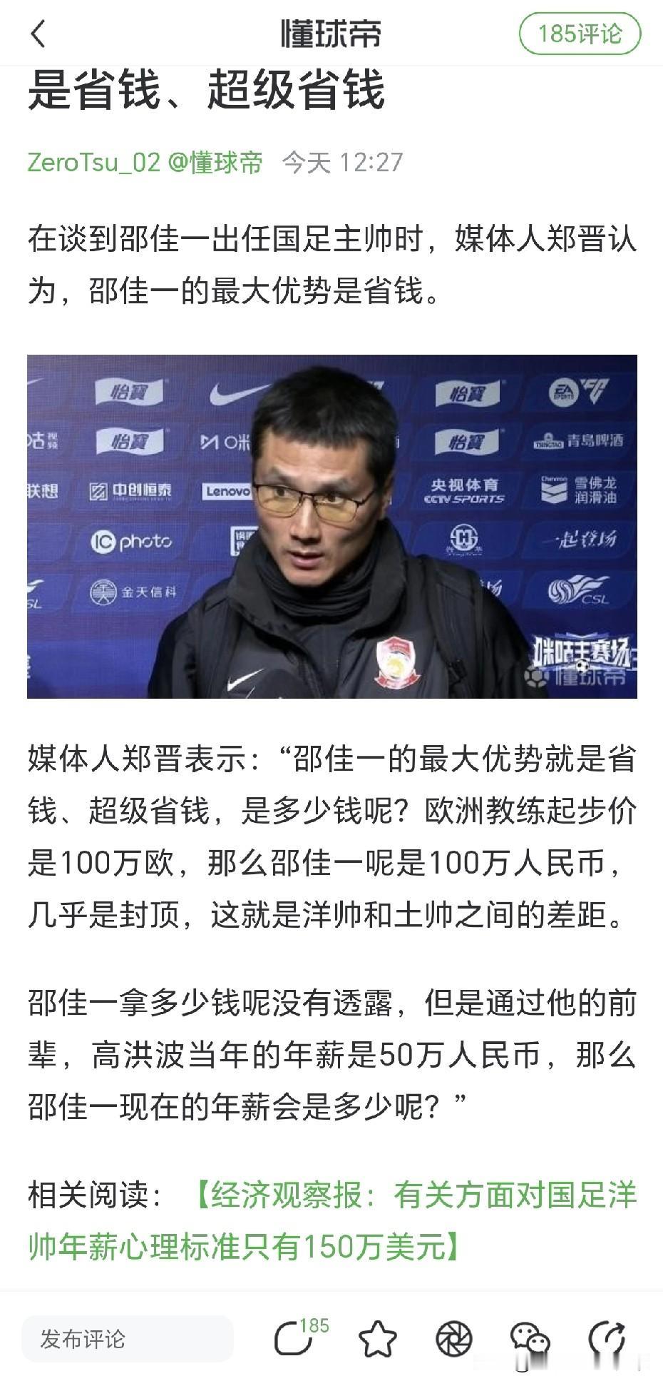 邵佳一在国足的年薪才100万RMB?欧洲教练起步价都是100万欧,这差距也太大了吧? 不过反正国足教练找谁都一样,里皮之前2000万欧的年薪,不也一样进不了世界杯?所以干脆就找个便宜的省点钱,思路也没错。 我估计足协是看到中国男篮用本土主帅效果也不错,现在也换国产教练试试了,再说佳一身边还有一个高级的德国助教毛雷尔。 我还是比较邵佳一+毛雷尔的组合的。下面就看佳一如何选人了。希望多选一些年轻人。