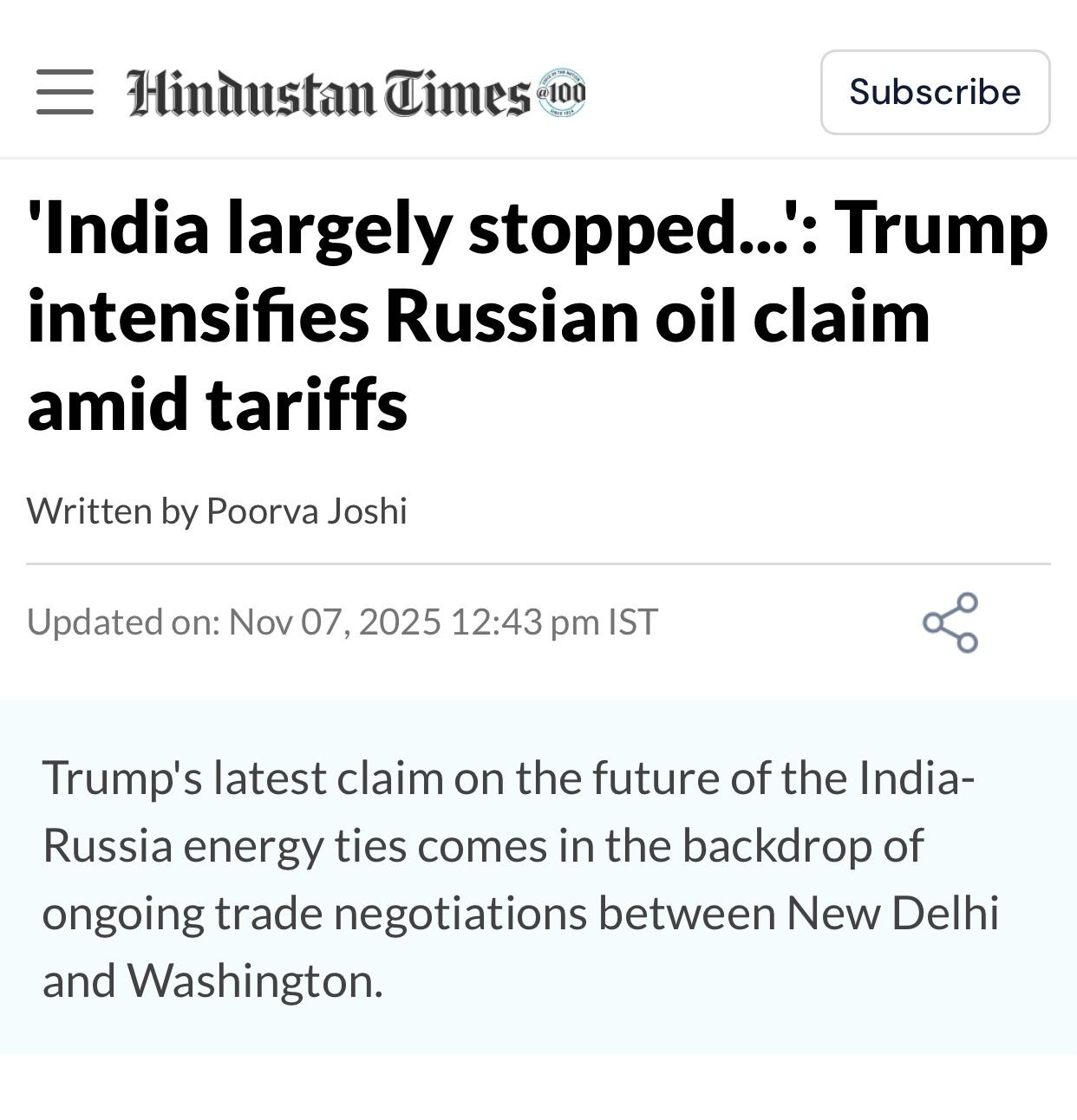 印媒:特朗普称印度”基本上停止了购买俄罗斯石油” 印度《印度斯坦时报》官网11月7日报道:美国总统特朗普在声称印度将很快暂停其与俄罗斯的石油贸易数天后,进一步强化了这一说法,现在称印度已“基本停止”(“largely stopped”)购买。 报道说,特朗普周五在白宫与媒体互动时发表了上述言论,甚至表示明年可能会访问印度。“(与印度的贸易谈判)进展顺利,印度基本上停止了从俄罗斯购买石油。他是我的朋友,我们聊过,他想让我去那里。我们会解决这个问题,我会去的……”,特朗普说道。 报道说,特朗普关于印俄能源关系未来的最新言论,是在新德里和华盛顿之间正在进行的贸易谈判的背景下提出的,俄罗斯石油是该讨论的核心。特朗普对印度进口商品征收了50%的关税,该关税于8月生效。虽然从那时起,特朗普对印度的语气曾经发生变化,但他仍然要求印度必须停止俄罗斯的石油贸易。 报道说,特朗普早些时候声称,总理莫迪“向他保证”,印度会很快停止与俄罗斯的石油贸易。“.…..我对印度购买石油感到不高兴。他(莫迪)今天向我保证,他们不会从俄罗斯购买石油。这是一大步”,这是他在10月首次说的话,之后又重复了几次。 然而,印度否认了特朗普对俄罗斯石油的主张,称其不知道总统和莫迪总理之间的任何电话。 印度外交部发言人贾斯瓦尔(Randhir Jaiswal)曾表示:“关于莫迪总理和特朗普总统之间是否有过对话或电话的问题,我不知道两位领导人昨天有任何对话”(“On the question of whether there was a conversation or a telephone call between Prime Minister Modi and President Trump, I am not aware of any conversation yesterday between the two leaders”)。 报道的原标题是《’India largely stopped...’: Trump intensifies Russian oil claim amid tariffs》(“印度基本上停止了......”:特朗普在关税问题上强化对俄罗斯石油的言论)。