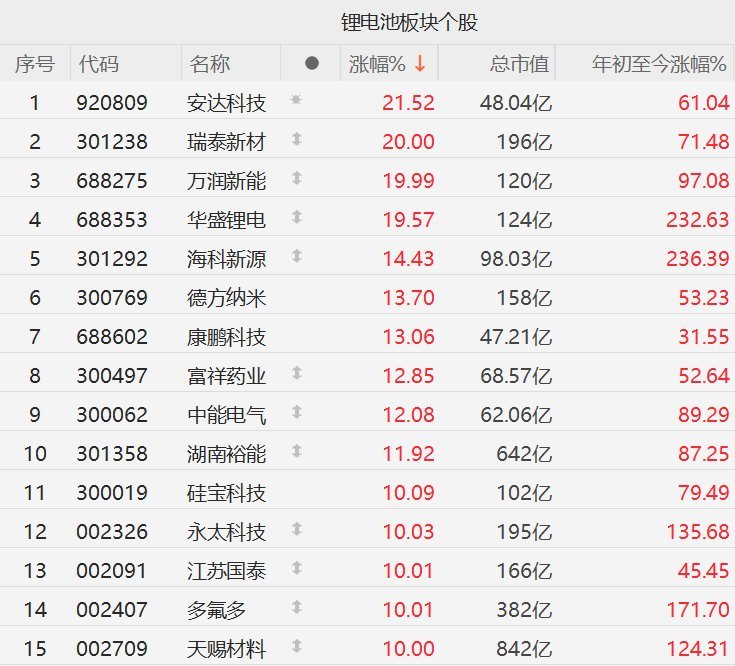 【A股锂电池板块持续爆发 十余只成分股涨停】锂电池板块十余只成分股涨停 11月7日,午后锂电池板块持续走强,电解液、磷酸铁锂方向领涨,丰元股份、永太科技、天赐材料涨停,此前瑞泰新材、多氟多、石大胜华、天际股份等十余股涨停。消息面上,东吴证券研报指出,10月电池排产进一步提升10%,旺季再上台阶,预计11月排产仍小幅提升,高景气度延续,其中储能需求超预期,价格已上涨1~3分/wh,预计第四季度仍有提升空间。