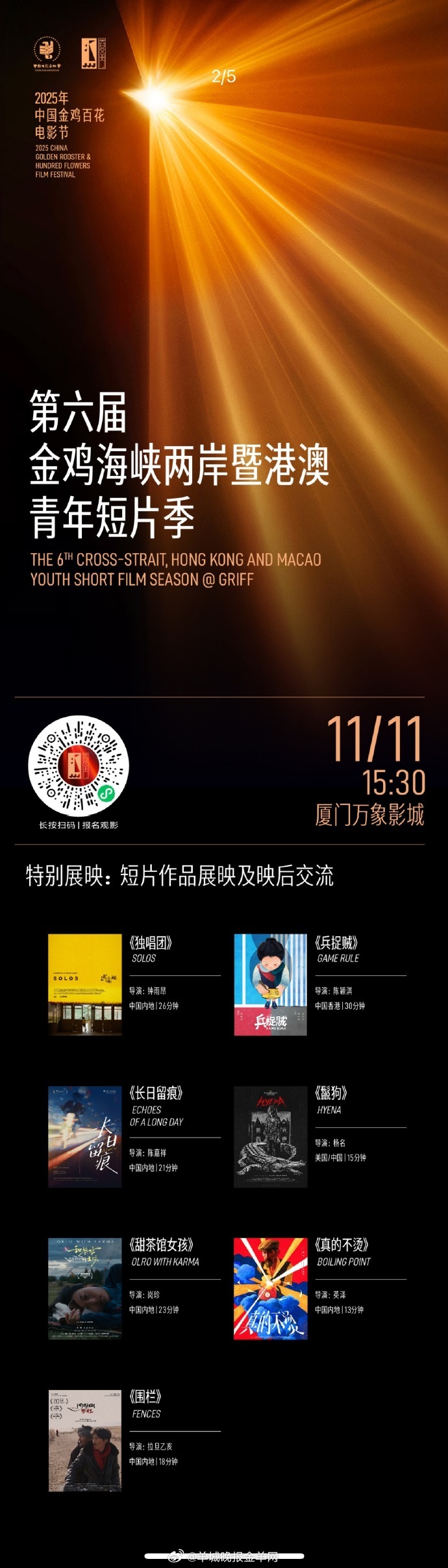 第六届金鸡海峡两岸暨港澳青年短片季公布展映片单,由山海计划扶持拍摄、青年导演陈嘉祥执导的《长日留痕》入围特别展映单元,并将于11月12日厦门万象影城放映交流,欢迎大家报名观影🎉