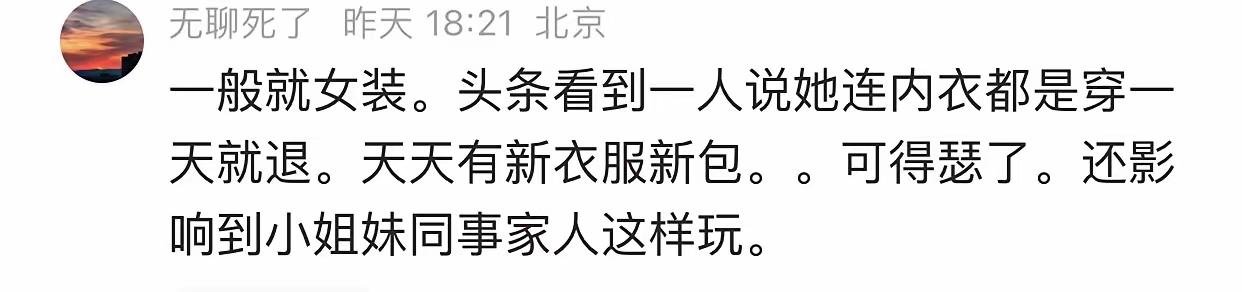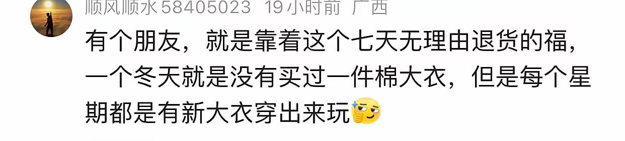 坐地铁时,就看到过好多女生穿着吊牌上下班的,一直以为人家太粗心,怎么连吊牌都忘记剪掉了,原来这是一群白嫖党。 利用七天无理由退货的规则,不花一分钱,每天都有新衣服穿,这样的行为真的好吗? 大家对此怎么看?
