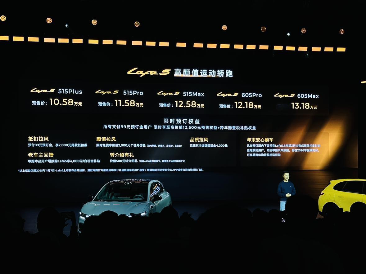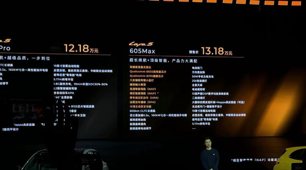很有趣的是这次零跑Lafa5推出了plus,pro,max版本,不一样哦~ 价格我猜少了,按续航分,515km和605km,515km对有三个版本,预售价入门Plus版本10.58万元起;Pro版本11.58万,Max版本12.58万元,等级不一样各加一万。 605km续航的是Pro和Max版本,12.38万,13.18万元~ 说一下13.18万元的顶配有什么,高精度线激光雷达,Qualcomm 8650高性能芯片,Qualcomm 8295座舱芯片,六处辅助驾驶小蓝灯,端到端大模型,高速智能领航(NAP),城区智能领航 (NAP) ,停车场记忆泊车(HPA),运程泊车辅助(RPA),16项主动安全功能,全是智驾方面的~ 再来看一下515kmMax版本12.58万元,和13.18万元的智驾内容是重叠的。 智驾版车型都只有在Max版本,Plus和Pro都是除了智驾之外的满配了,其实零跑的意图也很明确了,Lafa5就是想要做一款好看的,有个性差异化的,但又能很智驾的,通过智驾得到好玩的年轻的产品~ 这件事情和零跑的底层逻辑是相通的~ 我对零跑汽车的了解,他们在入门车型当中肯定会给的很全,这次也不例外,通过C系列和B系列的加持,或者说市场的进步,Lafa5是可以做到很多零部件通用……但是要走个性的小车路线,而且还是希望走量的小车,营销传播,如果仅仅靠零跑汽车目前的标签,我感觉还是要变变样子了。 包括外观的颜色方面,这次会有两个新增色,之前在视频里面和大家分享过,风驰电掣的黄和灰。 其他颜色相对会比较传统,所以问题是既然要走个性的小车,能不能在原厂的车漆上面就有一些不同呢?目前看起来他的传统车漆还是会延续C系列跟B系列。 另外一方面他们会有一款Ultra版本车型,当然在动力上面会有更多的加持,可能之前所说到的弹射起步模式会在这个版本里面体现,这个版本也会有很多新增的配件,这是大家可以期待的。 总体来说,这款车型我觉得底层逻辑还是零跑汽车,虽然听起来好像是一个全新的品类和之前的C系列B系列都相差很大。 可大家要明确的是零跑汽车,从一开始的S01就是一款轿跑,虽然这款车型在品牌和销量层面上只能算是为现在的零跑铺路,但是在零跑汽车的基因当中,他们一开始就是想要做一款好玩有趣个性,没有那么主流的车,他们血液里面的基因是这样的,只是现在有条件能够把它再次做出来,非常具备白羊座的创新挑战,不服输的个性。