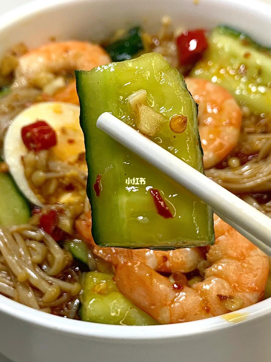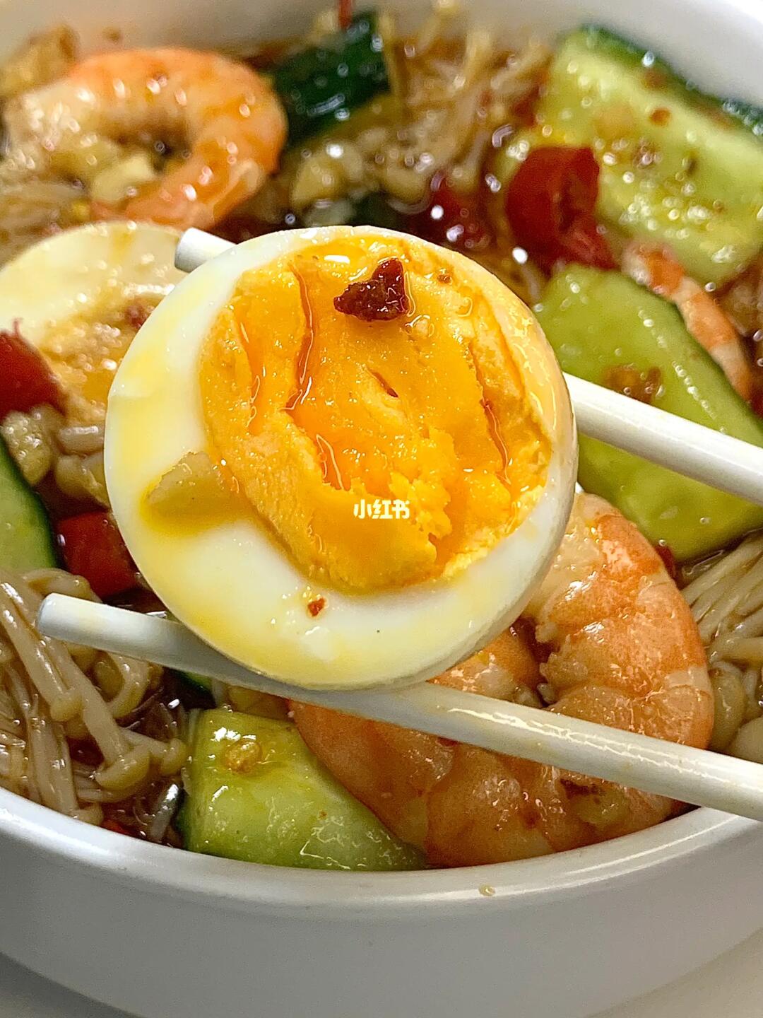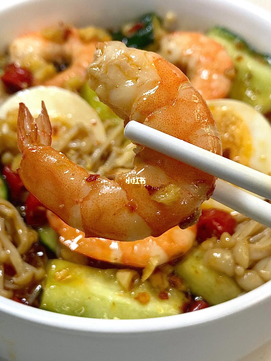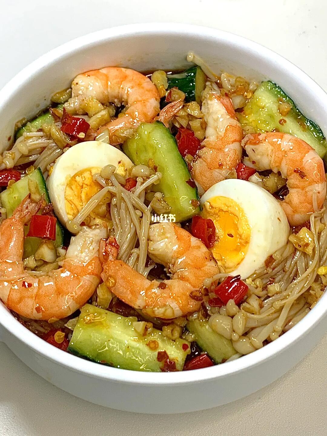 今天分享一道凉拌菜「金针菇拌虾仁鸡蛋」真的巨巨好吃!虾仁巨鲜美!金针菇入味巨香😋搭配灵魂酱汁真的绝了! 减脂的姐妹们快来试试呀[派对R] 食材:金针菇 鸡蛋 虾仁 黄瓜 [飞吻R]做法:先把金针菇煮熟 鸡蛋煮熟 虾仁煮熟 黄瓜切小放入碗中 淋上调好的酱汁拌匀即可✅