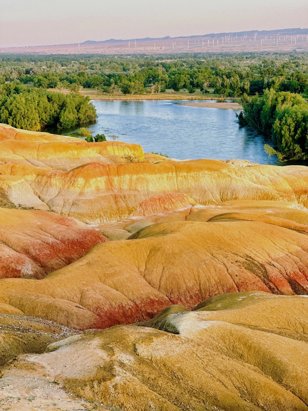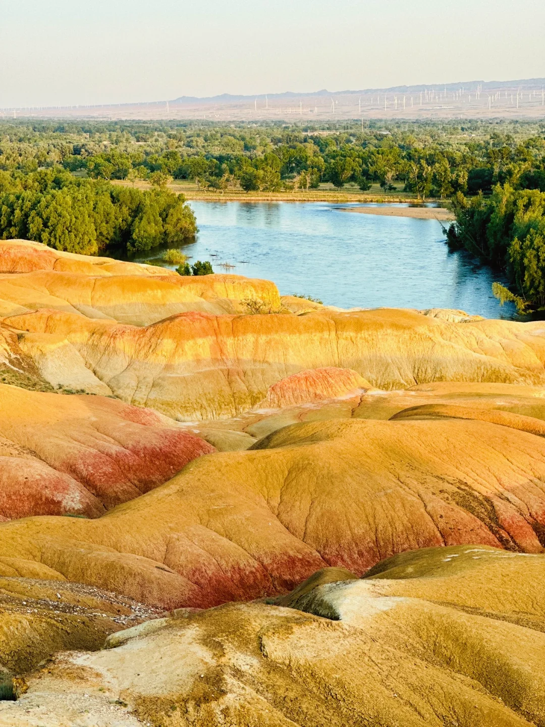 五彩滩一半是绿洲,一半是彩色丘陵,也因岩石层中含有不同的矿物质而拥有不同的颜色,在夕阳的照射下,会显出“红,橘,黄,紫,白五种色彩,非常的神奇,虽然以前也看过七彩丹霞,但是五彩滩的美也是独一无二的