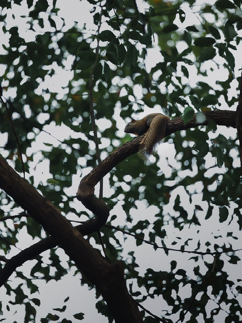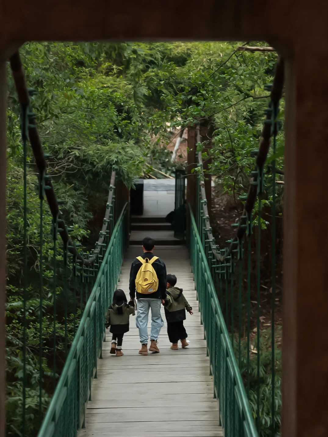 进门右手边的大桥下是一个珍稀植物园,沿着小路走进来,成片的绿色植物和茂密的大树,构造成了一片森林的模样,就像藏在植物园的一处从林秘境,不管是来这里拍森林风还是徒步风,都满满的氛围感,并且我们还在这里偶遇了小松鼠