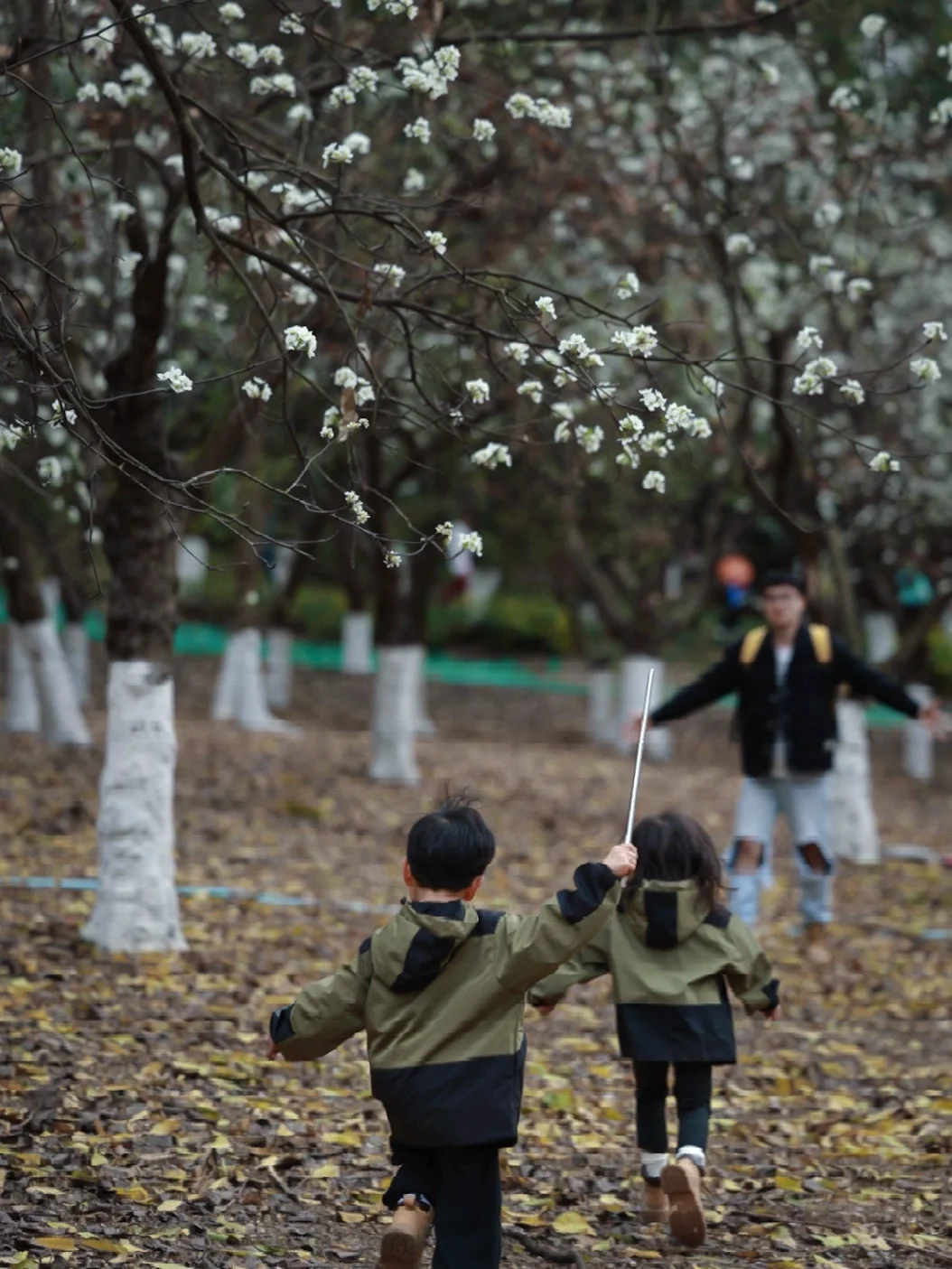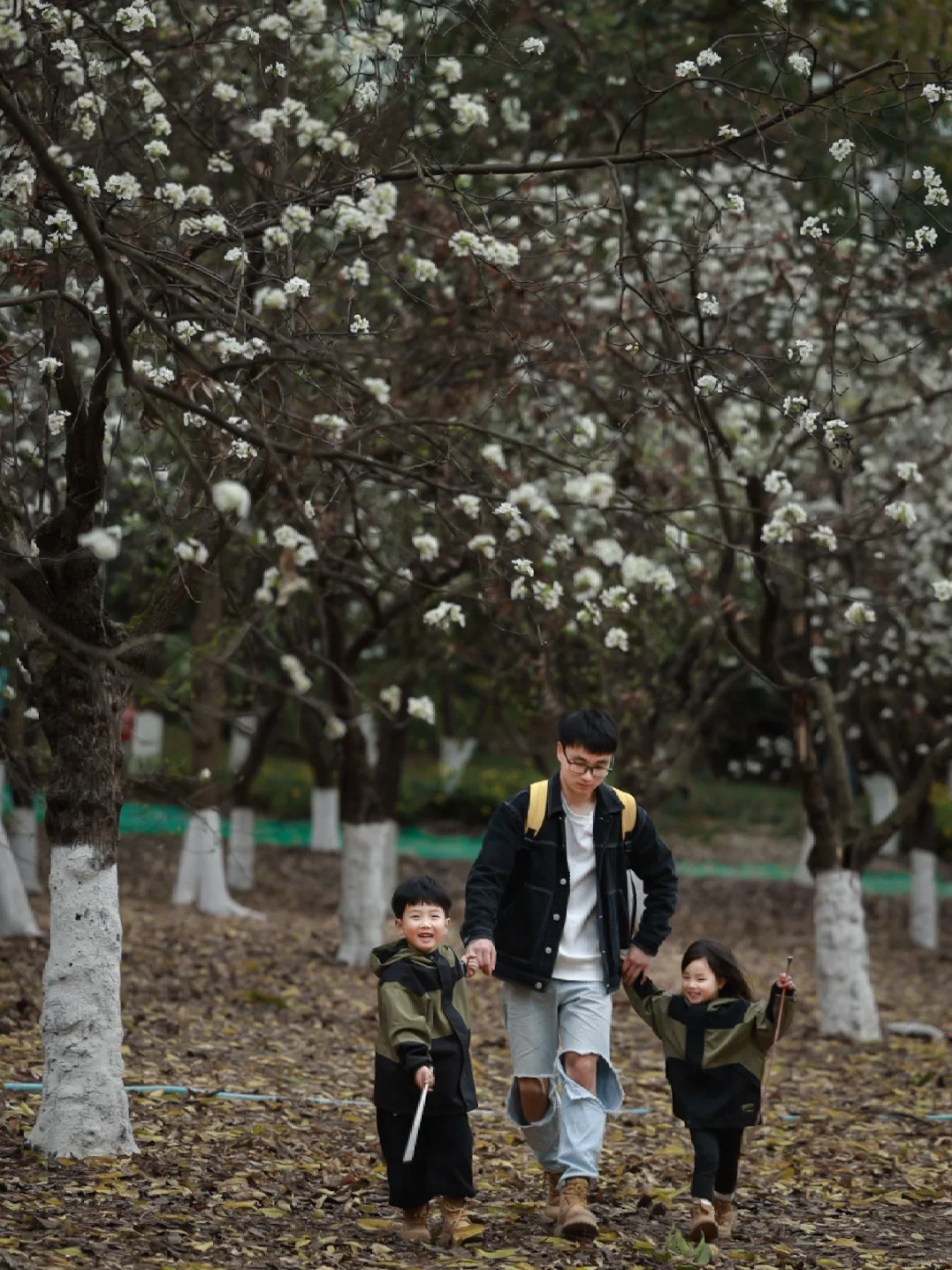 园区最近的樱花已经掉光,但是一大片梨花却正是盛开的时节,孩子在雪白的梨花树下嬉戏奔跑,这场景简直太美好了,不过最近树下人特别多,一定要早点来