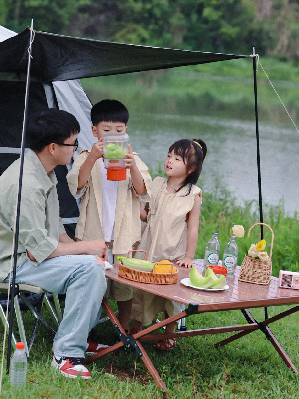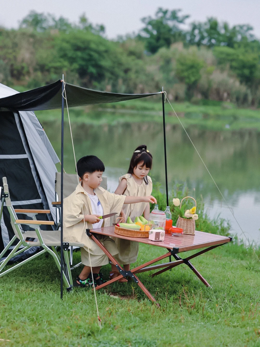 我们的家庭出游一般以简单为主,所以只带了帐篷和桌子板凳,一家人坐在河边吃着东西吹吹风非常惬意!