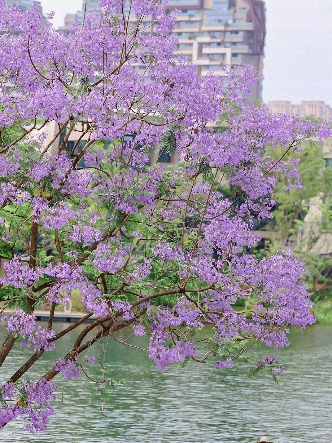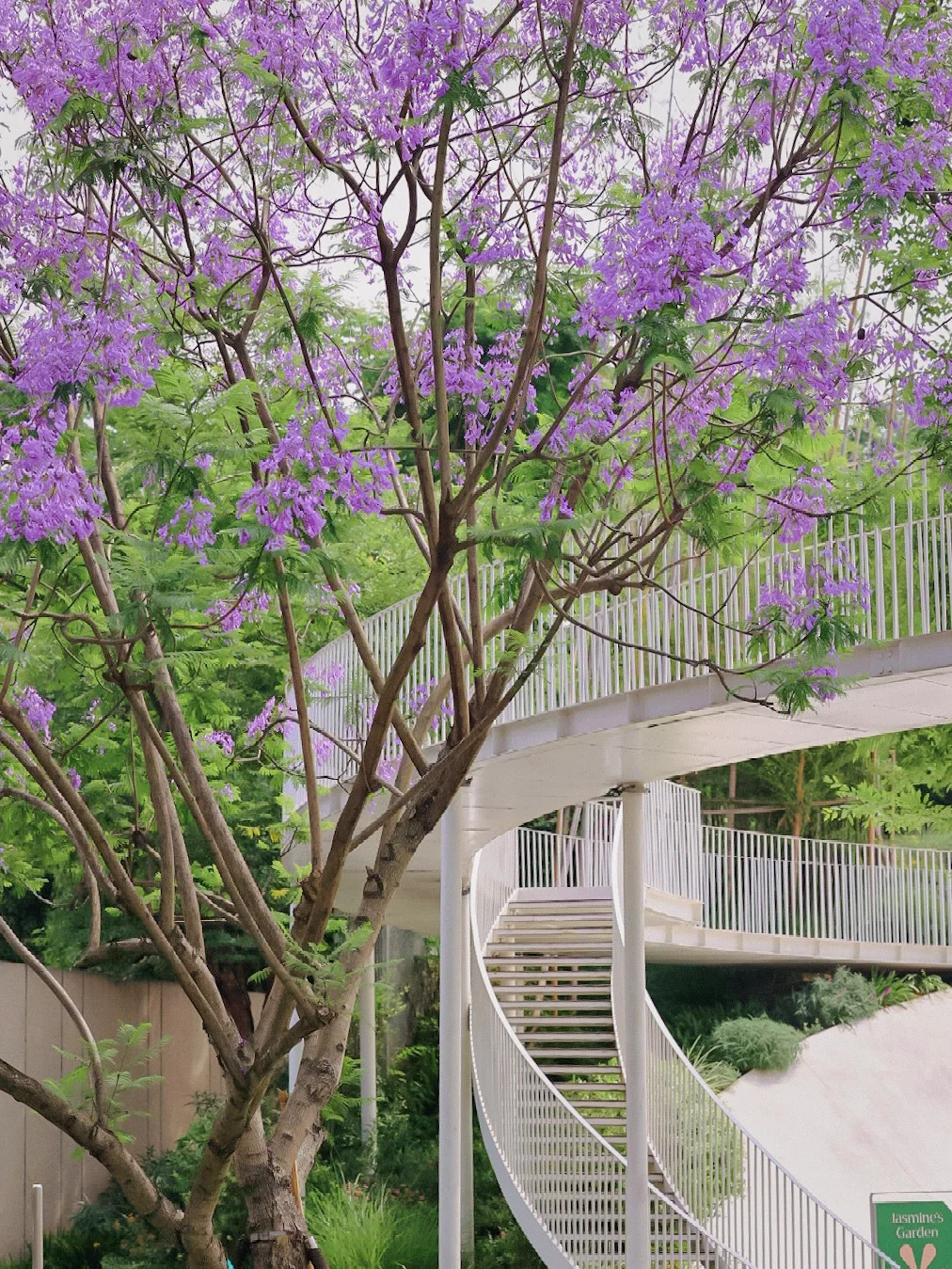 2⃣️蓝花楹树一般都很高,但是在这里的扶梯上去,却能触手可及,整个人都可以被花海包围,很难不出片