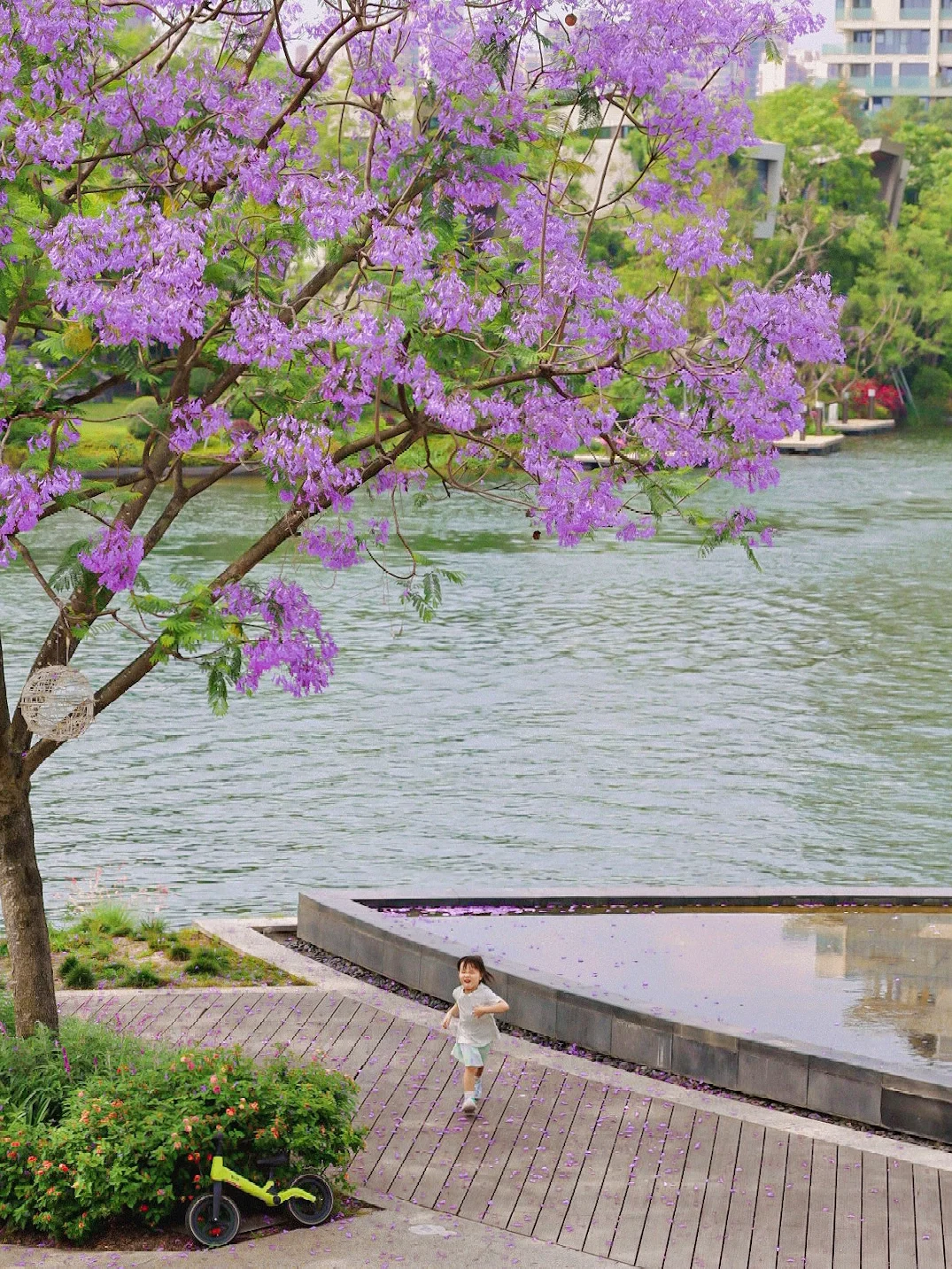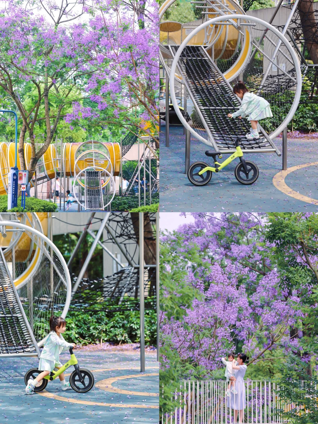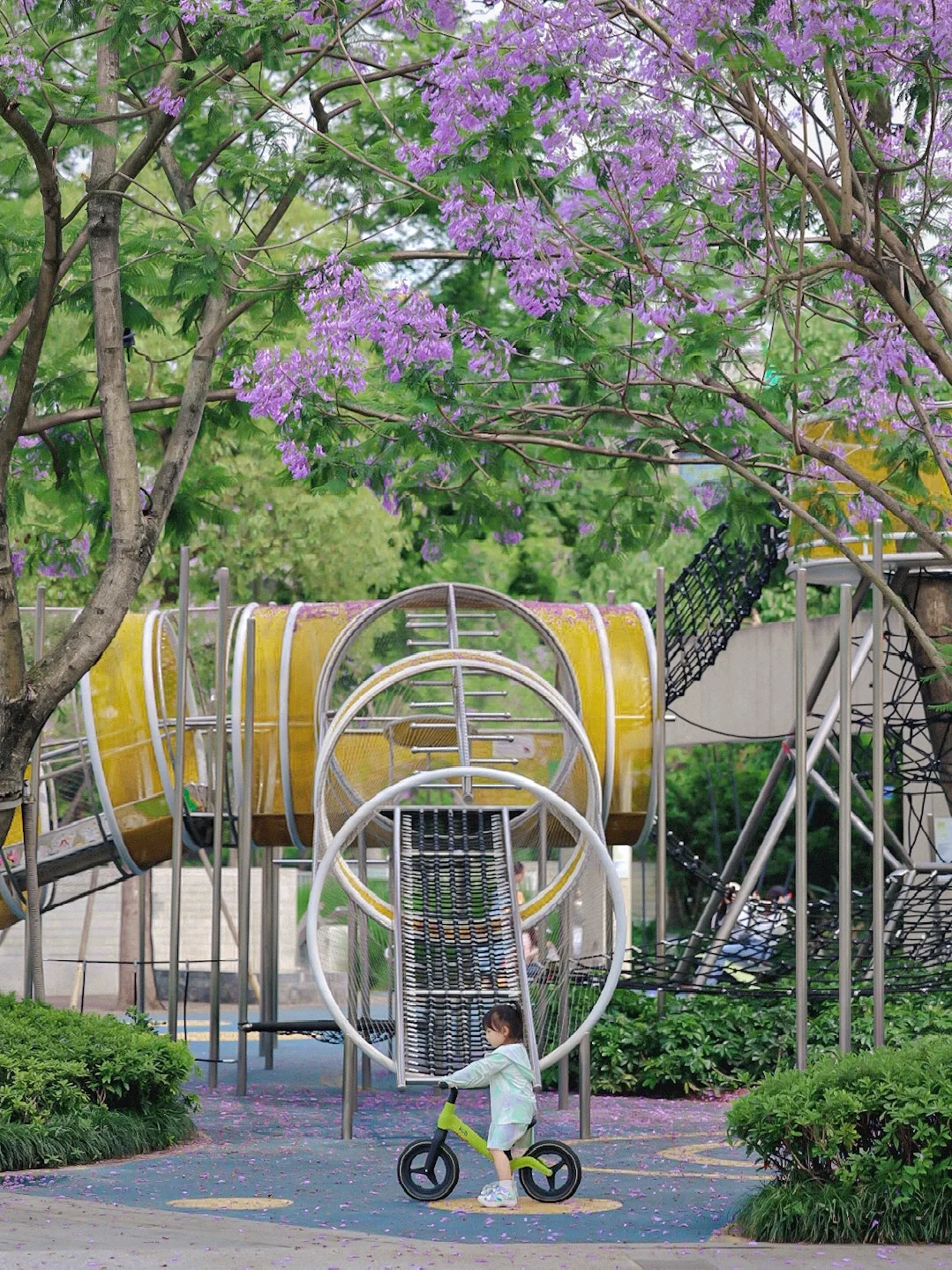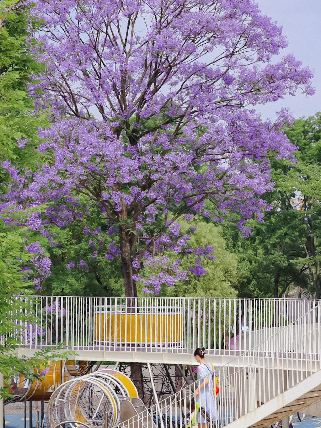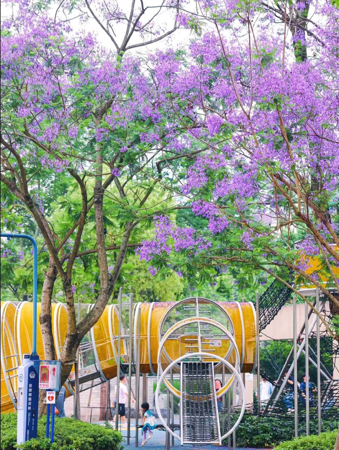 1⃣️黄色的游乐设施配上蓝花楹真的很好看,孩子在树下游玩奔跑,随便一拍都像一幅画