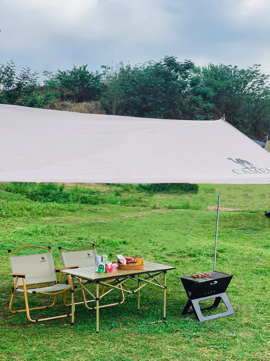 黑胶天幕+蛋卷桌+2张折叠椅+便携式烤炉(自带三斤炭火)+露营氛围灯: 这一套是我每次出门露营必带的装备,不仅方便而且性价比非常的高,一套都还不到五百就能轻松实现户外自由