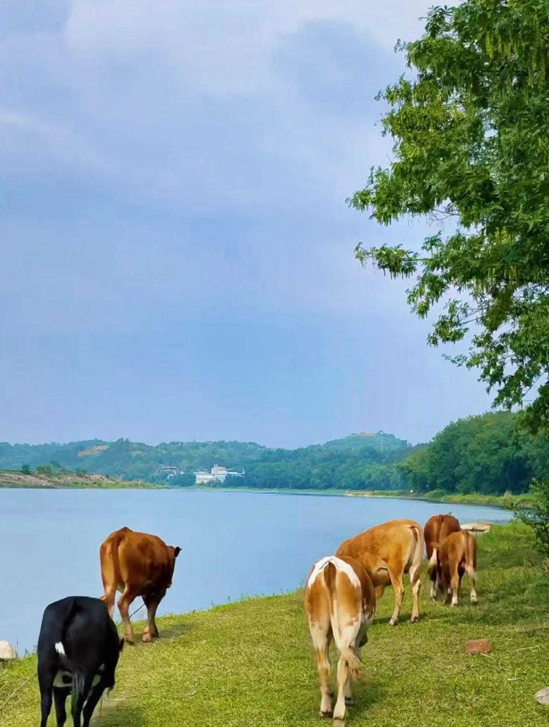 3⃣️河边有超级大块绿色草坪,牛羊成群风景绝美