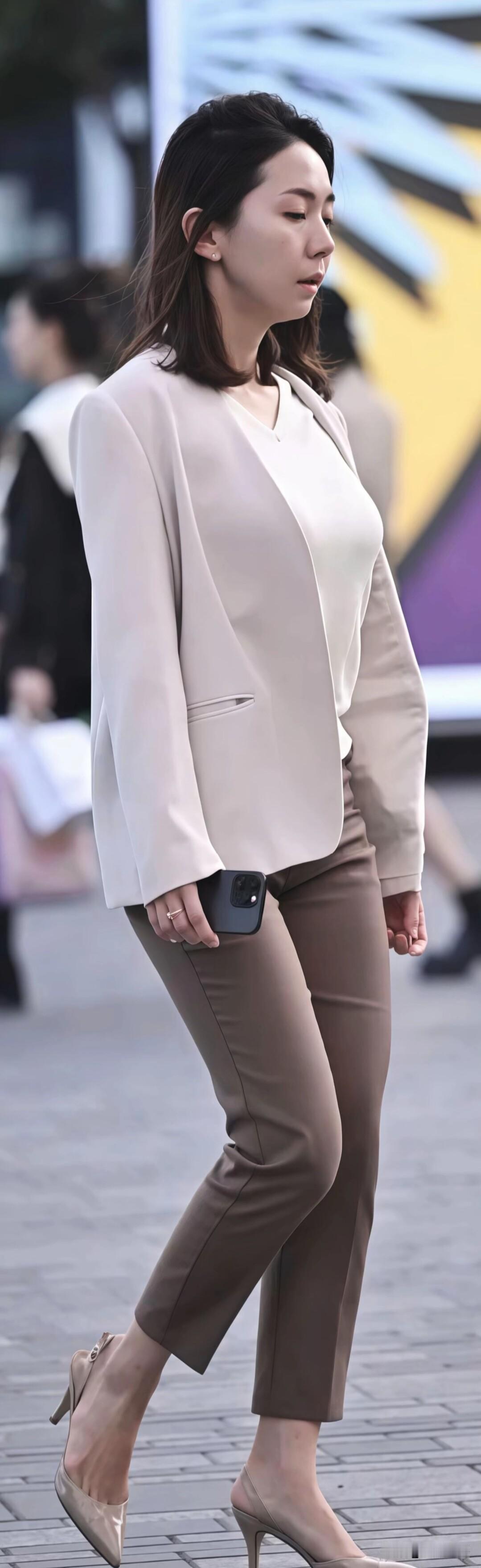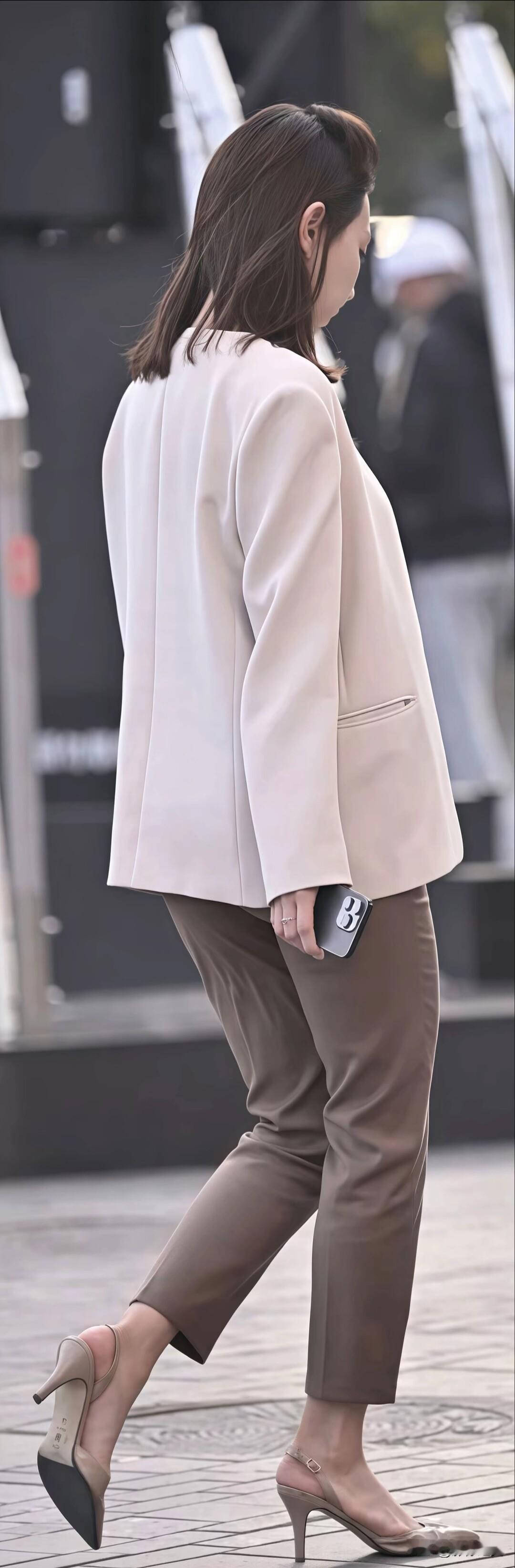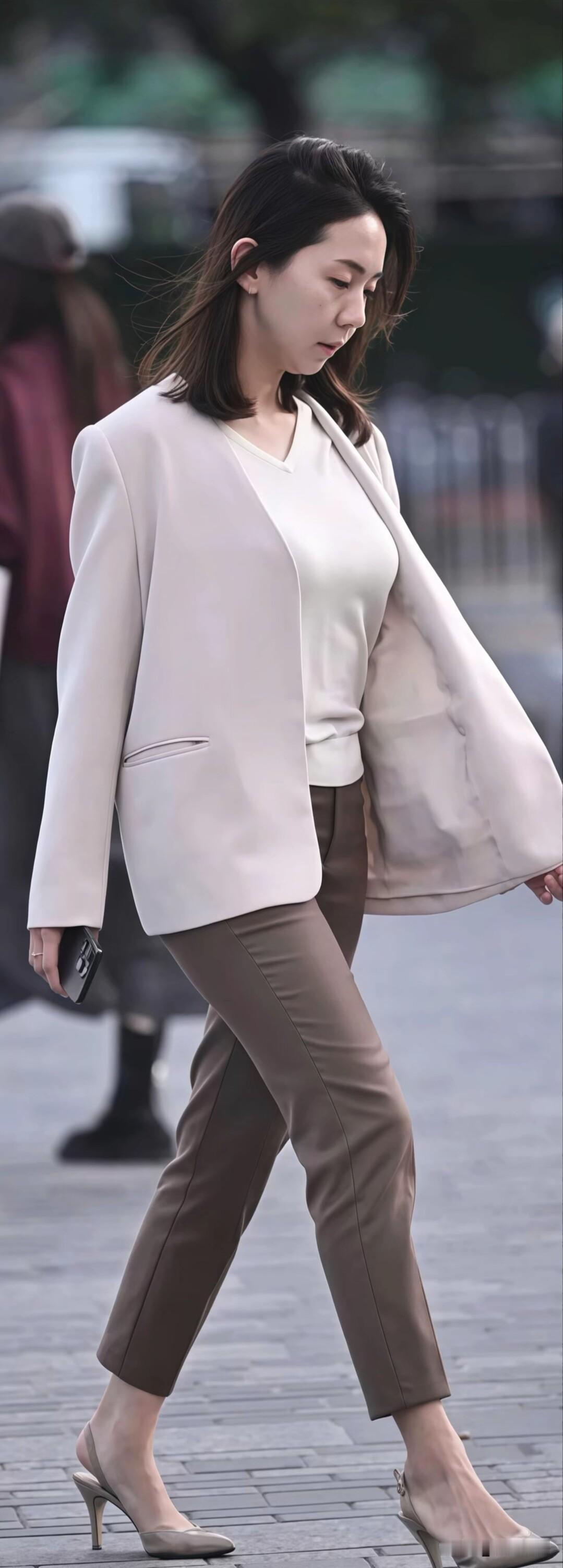 街头的职场穿搭模板!浅米色西装搭棕色西裤,配同色系高跟,简约干练又显气质,这样穿去上班超有范儿~