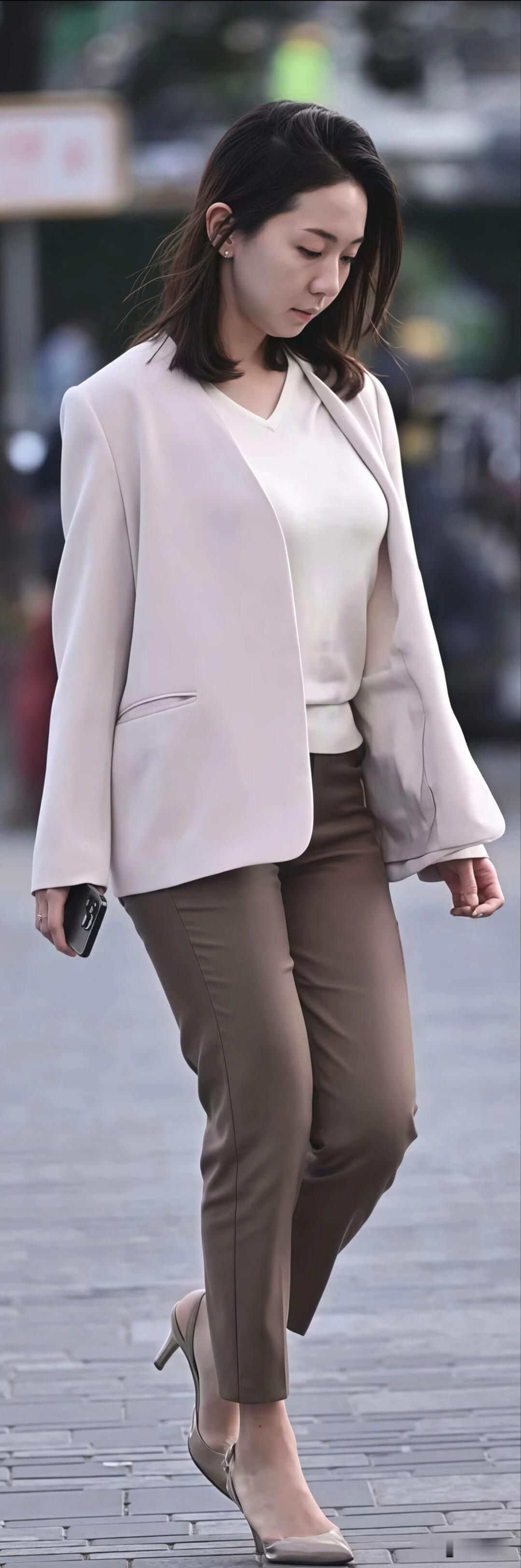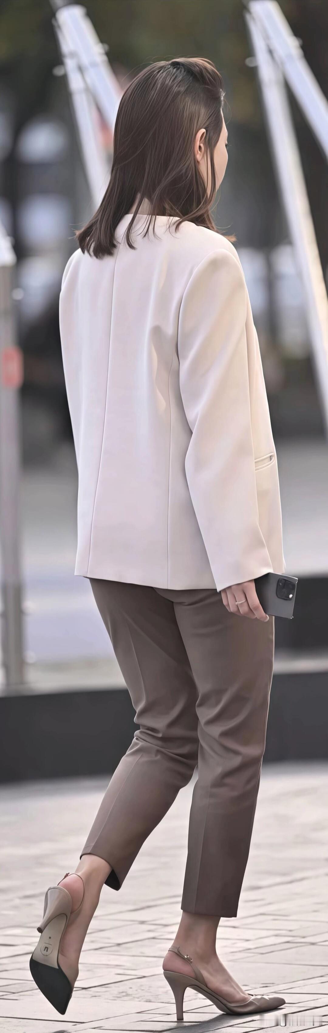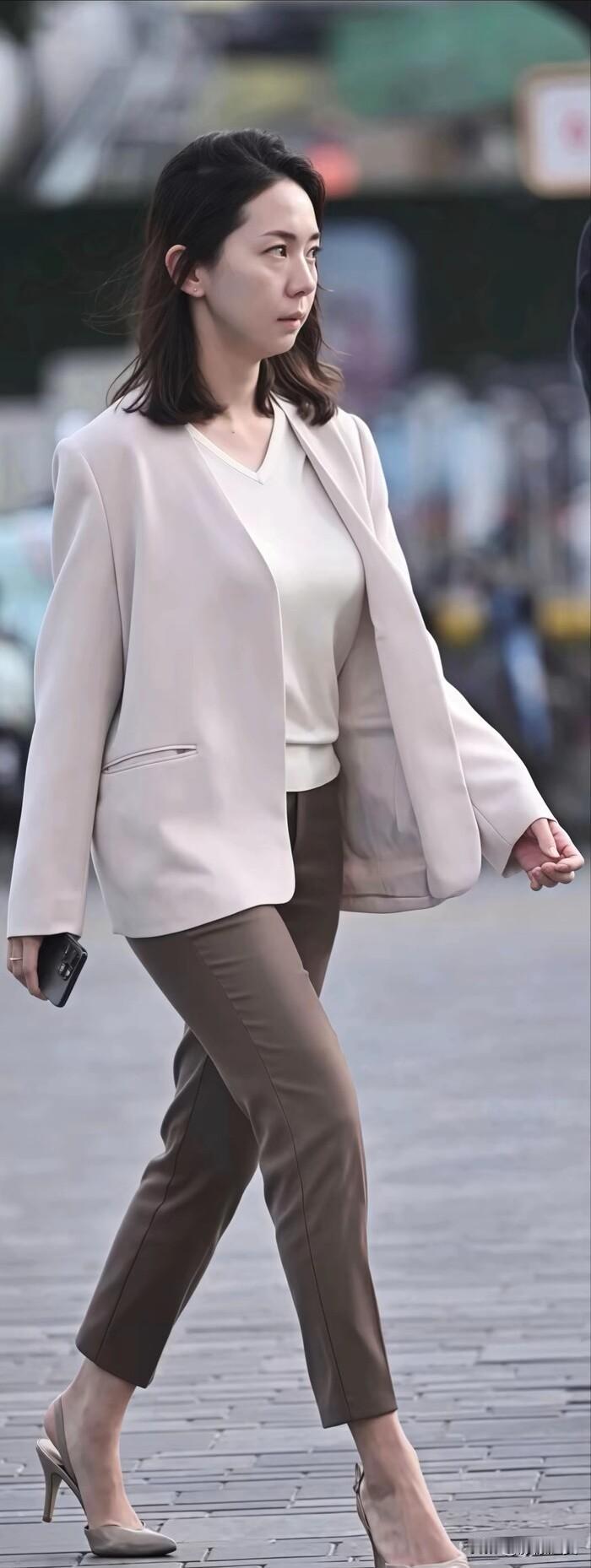 街头的职场穿搭模板!浅米色西装搭棕色西裤,配同色系高跟,简约干练又显气质,这样穿去上班超有范儿~