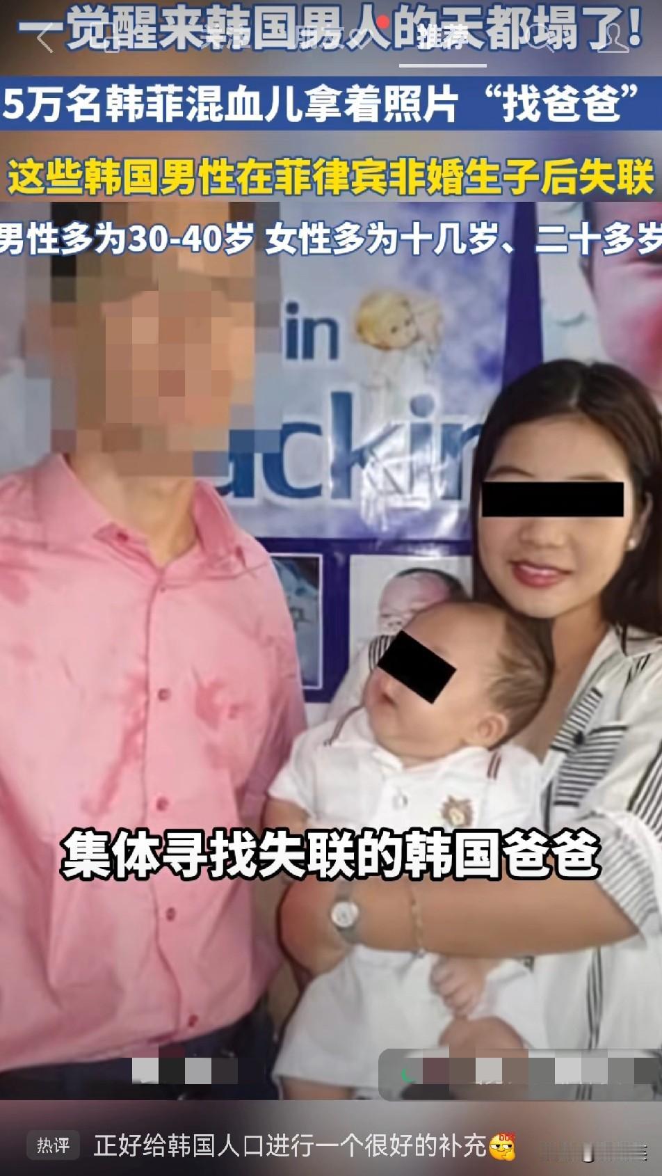 一觉睡醒韩国男的天塌了 5万混血儿拿照片“堵门” 最怕的不是法律是社死 谁能想到,菲律宾5万韩菲混血儿拿着照片“找爸爸” 直接把韩国失联男性的底裤扒了 这些30-40岁的男的,当年在菲律宾跟十几岁姑娘非婚生子后跑路 现在被照片一曝光,怕老家亲友看见“社死”,连夜联系生母掏钱 法律制裁 他们压根不怕,怕的是“好男人”人设崩了 这波“社死式维权”比打官司管用一万倍,毕竟脸比责任值钱多了 说多了都是讽刺