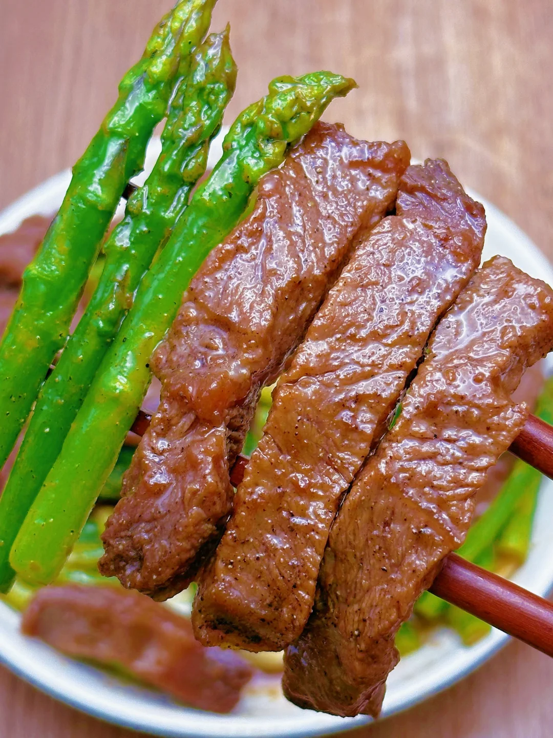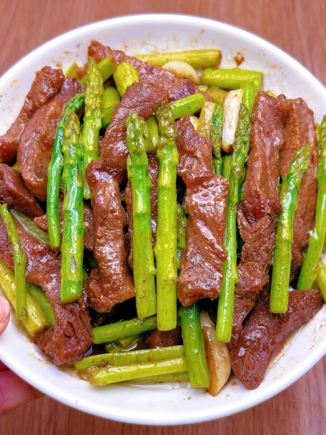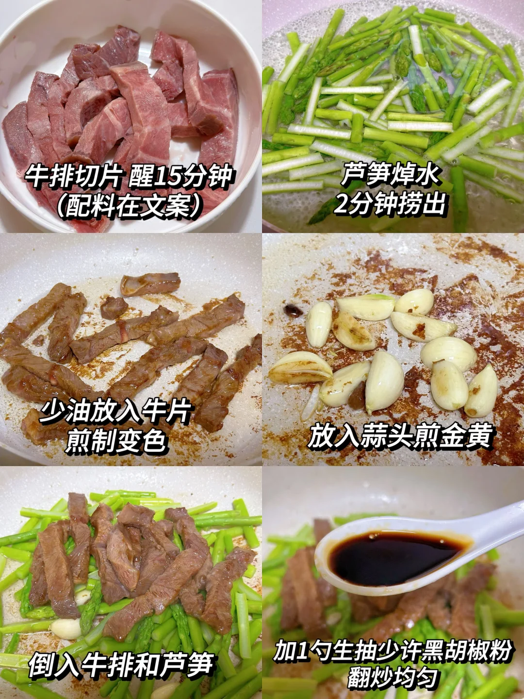 姐妹们今天分享的这道低卡高蛋白芦笋炒牛排~真的是鲜嫩美味,而且芦笋吃起来脆脆的,腌制过的牛排更加入味,真的非常适合减脂期姐妹,做法简单不翻车~ 🥗食材:我用的牛排(也可以用牛肉)芦笋 🥘做法:如图所示~ ✅腌制:牛排切成条➕一勺料酒➕一勺生抽➕一勺橄榄油➕一勺淀粉➕少许蚝油➕黑胡椒腌制15分钟 1️⃣芦笋焯水2分钟捞出备用 2️⃣少油放入牛排煎熟(变色就好)盛出备用 3️⃣放入蒜头爆香,倒入牛排芦笋,加入生抽少许黑胡椒翻炒均匀即可