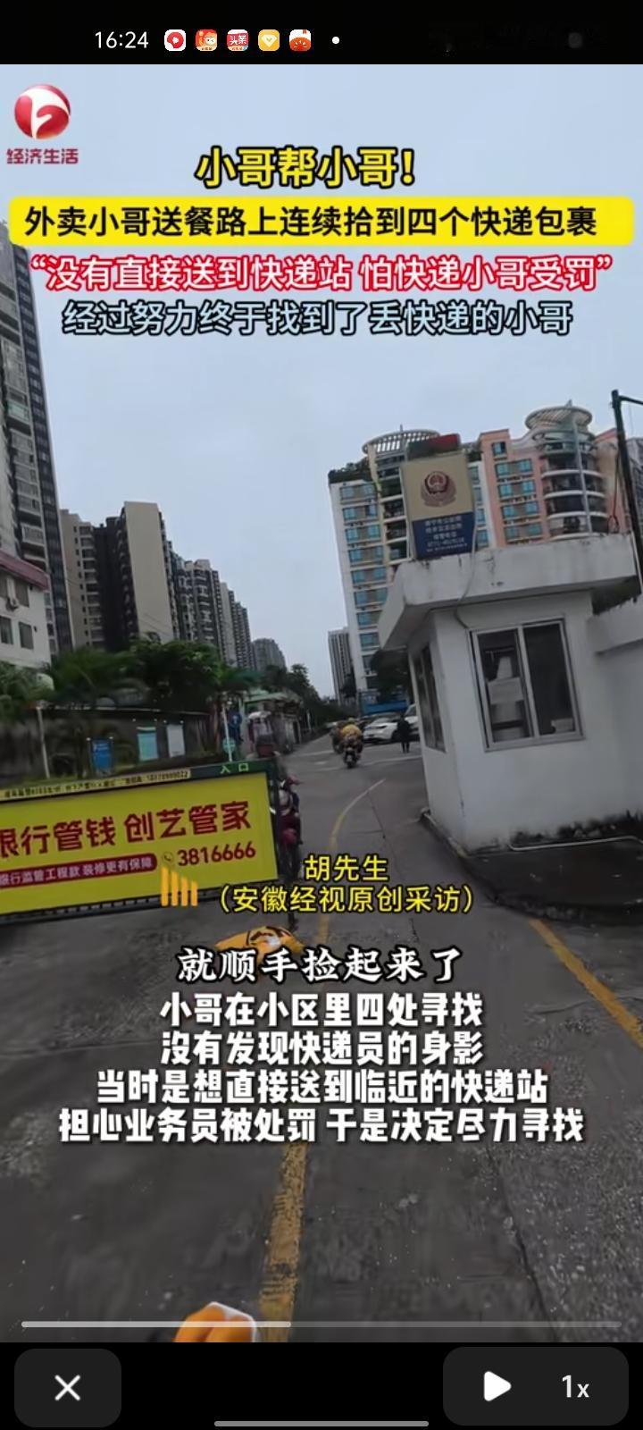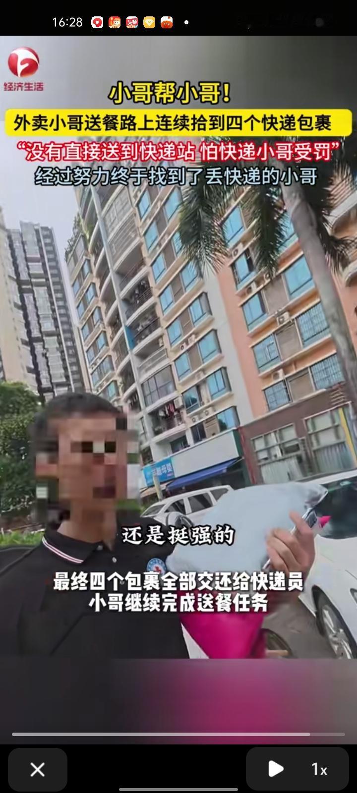 11月7日,广西南宁。外卖小哥在送货路上捡到四个快递包裹,于是立即停止送餐,在小区里寻找丢失快递的业务员,但找遍了没发现快递员的身影。外卖小哥胡先生表示,当时想着直接送到临近的快递站,担心业务员被罚。根据快递上的虚拟电话,小哥接连拨打,有可能收件人觉得是诈骗电话,都没有及时提供派送员的电话。 没想到客户的反诈意识很强,在小哥的不懈努力下,终于有收件人愿意提供号码,联系上快递员时,他还没意识到包裹丢失。最终把四个包裹全部归还给快递员,外卖小哥继续执行送餐任务。