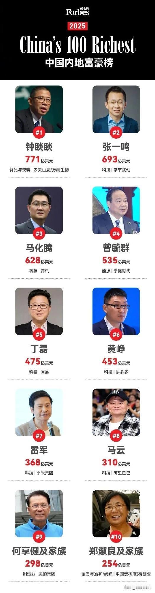 2025中国内地十大富豪榜 3个做实业,6个做互联网平台,1个新能源 “水王”钟睒睒连续5年稳坐榜首 其余两个做实业的美的和宏桥排在尾位 从这个排行榜上看👀 时代真的变了 卖水的比搞互联网的稳 造车的比玩电商的猛 互联网高科技和新能源行业是新趋势 不禁感叹: 不是风口消失了,是换风向了! 你手里那瓶水、桌上那台手机,可能正悄悄改变着财富版图呢~ 亿万富豪排行榜 钟睒睒 超级富豪排行 胡润全球首富 2025财富榜 财经 商业大事议 新能源 钟睒睒卸任浙江农夫实业法定代表人 企业家