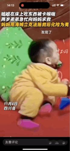 2岁的弟弟“临危不乱”,迅速果断救姐姐。四川,姐姐吃东西被卡以后,2岁弟弟救助未果立即向妈妈求助,姐姐终于化险为夷。 视频中显示,小姐弟俩正在房间的床上玩耍,家长则在另外的房间里做做家务。姐姐一边看着手机,一边吃东西。而弟弟则坐在床上,玩着他的小小挖掘机。 忽然他听到了异常的声音,他发现姐姐双手揪着喉咙,正在用力地咳着。细心的弟弟,马上爬到姐姐的身边,用力地在她背后拍了几下,可姐姐仍然咳着,而且越来越痛苦。 看见没有效果,弟弟立马爬下床,急急忙忙跑到隔壁房间来喊妈妈。小弟弟一路小跑着,一边跑一边喊:妈妈妈妈,你快点快点快点过来呀! 此时的妈妈仍然不知道发生了什么事,听到孩子的喊声,她不紧不慢地应了一声。她还以为两孩子打闹呢。 弟弟可真着急了,一把推开门拉着妈妈的手,就往房间里面拽。 这时候女儿的情况已经极其危险,只见小姐姐脸朝下趴在床上,软软的已经没有了声音,好像也失去了呼吸。 妈妈进门看到女儿的状况也吓坏了,但她没有丝毫的惊慌,她立即跳上床从后面抱住女儿,用海姆立克急救法对女儿进行急救。几分钟,女儿气管里面的零食,终于被妈妈挤压了出来,孩子得救了。 网友们看到这个视频,纷纷对小弟弟竖起了大拇指: 关键时刻临危不乱是为能成大事者。 这个小弟弟好棒哟,帮忙未果——迅速求助——观察不捣乱。 弟弟太厉害了,能及时发现,并且知道找妈妈,简直不得了,这孩子是穿越过来的吧 这姐姐以后得是宠弟魔了吧,以后他要把弟弟捧在掌心里痛哦。 我要说啊,这孩子发现问题、处理问题的能力也太强了吧?这才几岁啊。 估计和妈妈的教育水平有关系! 取材网络,侵删