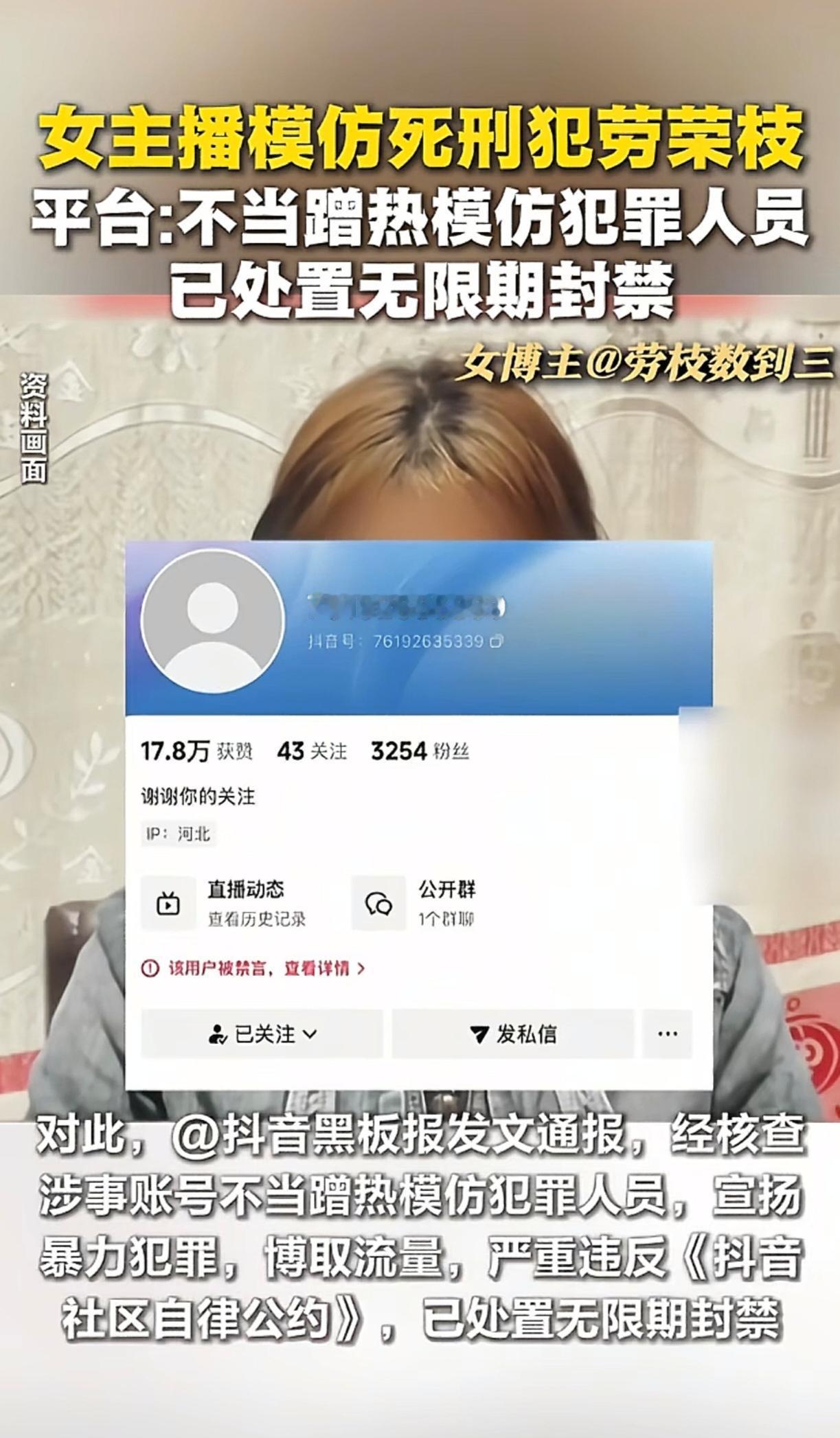 见过模仿球星科比的,模仿明星鹿晗的,第一次见到有人为了博人眼球模仿死刑犯的。 一女子为了能够吃上互联网这碗饭,梳同款发型,模仿劳荣枝法庭上“我没杀人,都是法子英逼我的,我这辈子没有杀过一只鸡一只鸭”的谈论,为了能够快速起号,甚至专门模仿劳荣枝的神情。最后账号被永久封禁,真是大快人心。 为了红,连杀人犯都模仿。把别人的痛苦当成自己炒作的工具,这种毫无底线的行为,活该被封。