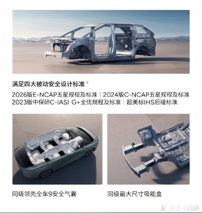 -安全:满足四大被动安全设计标准+全车9安全气囊+同级最大尺寸吸能盒