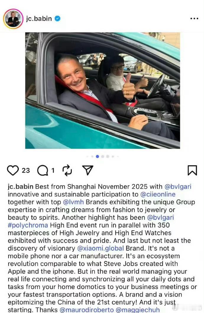LVMH集团旗下宝格丽CEO体验小米汽车及生态产品后,表示小米的成就已与苹果和乔布斯的革命性创新相当。他认为小米并非传统手机或汽车制造商,而是通过“人车家全生态”整合,实现了对用户真实生活的无缝管理,覆盖家庭自动化、商务会议、交通出行等全场景。