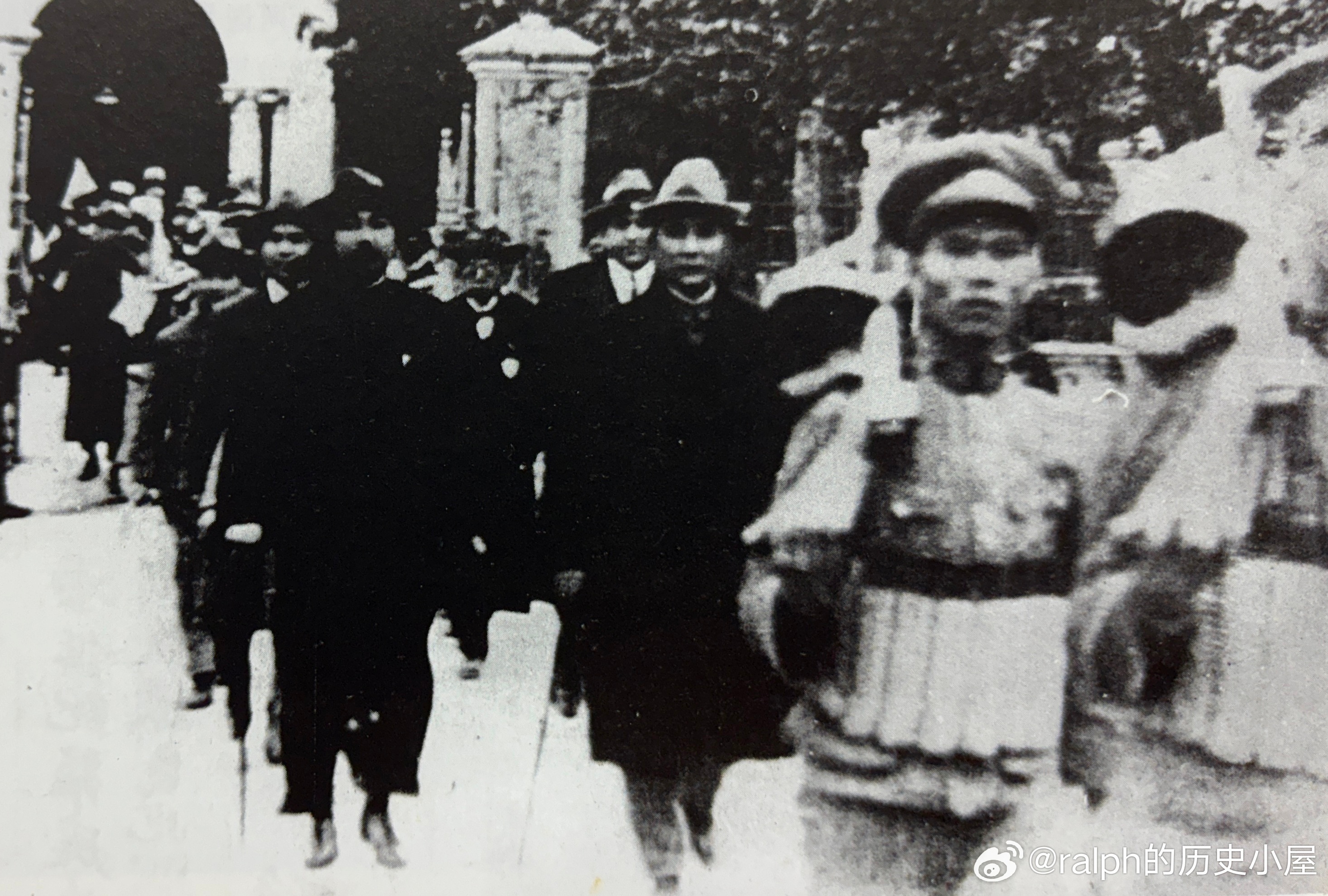 1924年1月20日中国国民党第一次全国代表大会在广州召开。图为孙中山与李大钊(左)步入大会会场历史影像