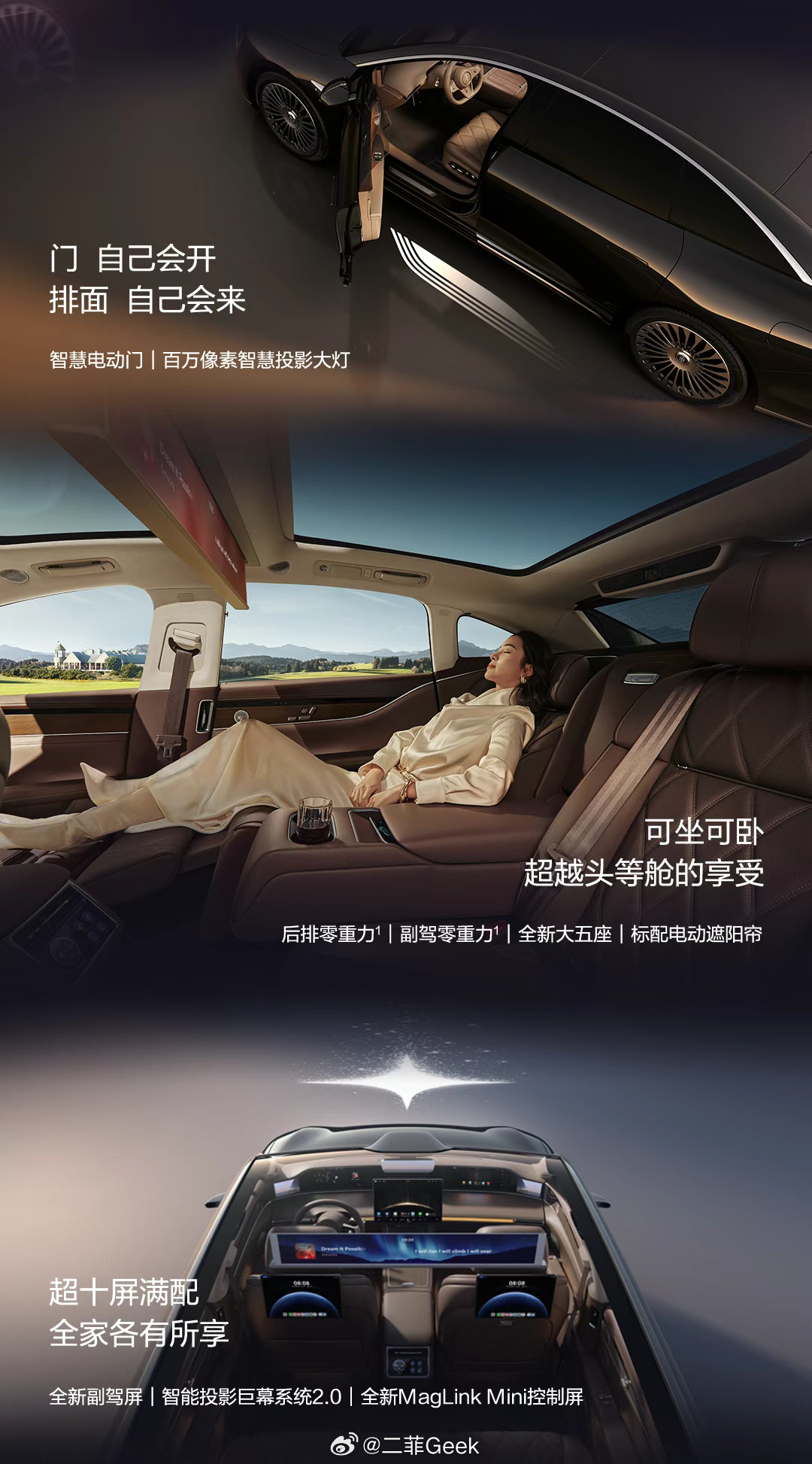 外观不用多说,星河璀璨大灯、星云尾灯、全新奢华轮毂……一眼优雅大气!车内空间更是观感和体验感兼备,座椅标配通风、加热、按摩,而且前后可选零重力座椅,现在很多传统豪车都没这种配置!还有智慧电动门、压缩机冷暖箱、更有尊界同款MagLink Mini控制屏,以及KK前备箱、隔空开门、隔空抓取、无麦K歌等超多豪华科技配置,这驾驶体验感绝了,现在已经可以小订了,预售价 31.8万起,年底给自己买个大礼物!喜欢的友友可以冲~