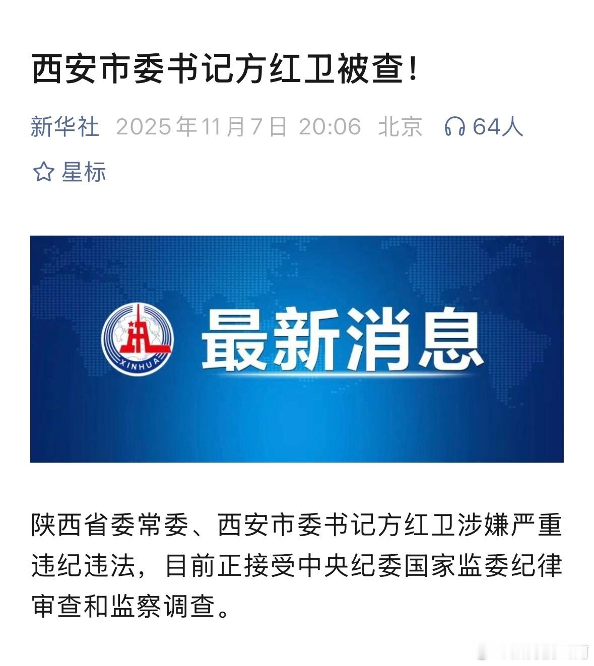 快讯:西安市委书记方红卫被查
