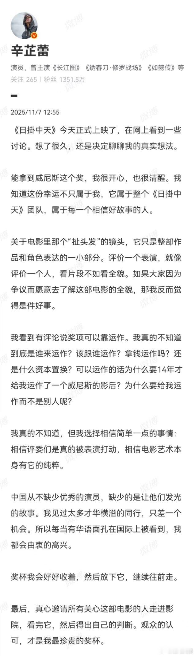 凭借《日掛中天》拿到威尼斯影后的今天发长文回应,称:《日掛中天》里那个“扯头发”的镜头,它只是整部作品和角色表达的一小部分。评价一个表演,就像评价一个人,看片段不如看全貌。如果大家因为争议而愿意去了解这部电影的全貌,那我反而觉得是件好事。