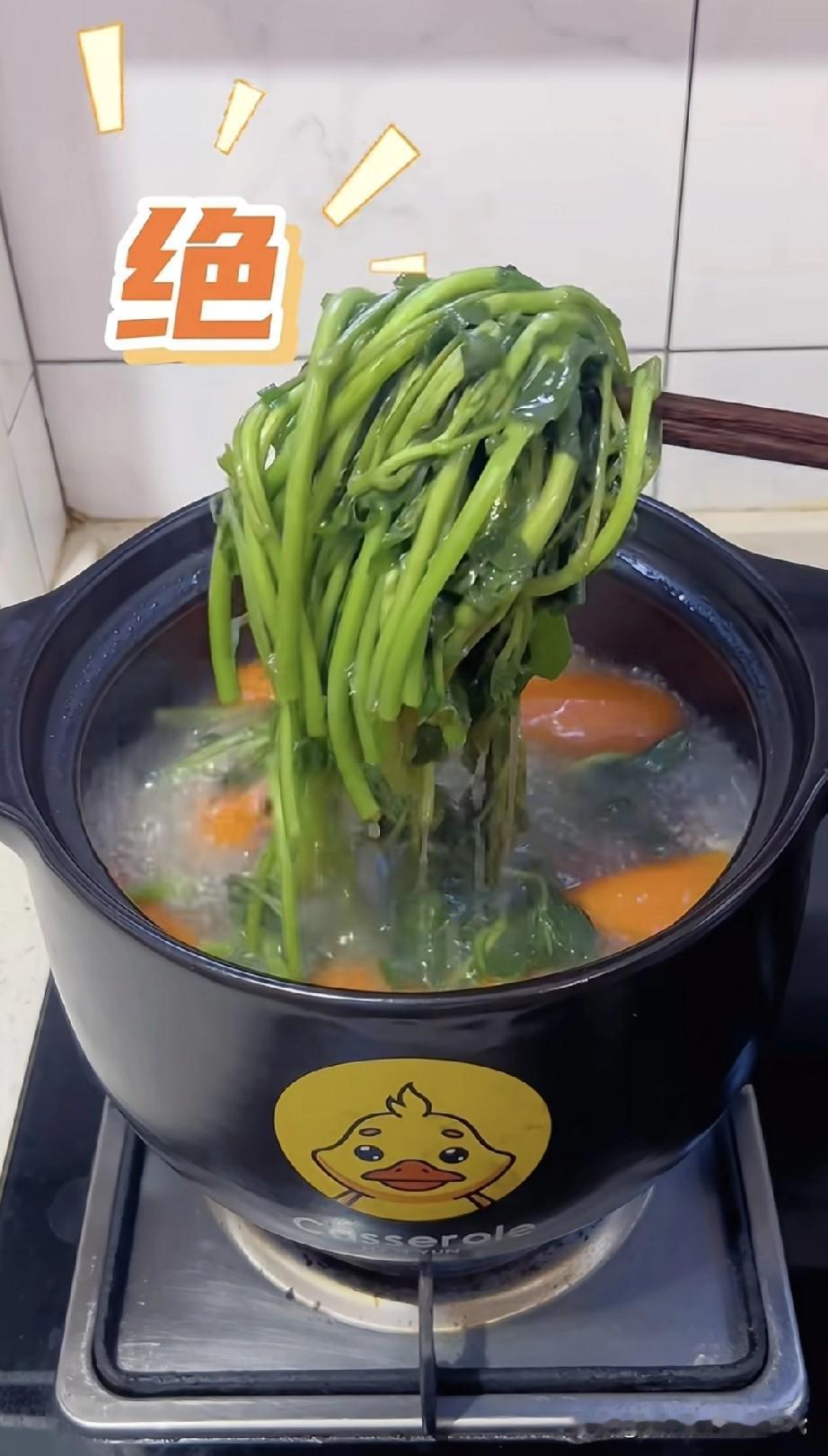 广东人把西洋菜煮进汤里,这操作到底是黑暗还是美味 外省朋友看到我家炖的汤直接愣住:这绿油油的草怎么能煮进肉汤里? 但广东人懂——先丢排骨、蜜枣、陈肾炖出鲜甜味,最后抓一把脆嫩的西洋菜扔进去,锅一盖,那股清润的香气能飘半条街! 这汤我从小喝到大:西洋菜吸饱肉汤的鲜,咬一口脆爽回甜;汤头带着菜香,秋冬喝润到嗓子眼儿。 但评论区吵翻了:有人说“这是喂猪的草吧”,有人喊“广东汤的精髓就在这”!你们说,把青菜煮进肉汤里,到底是奇葩吃法还是美食智慧?