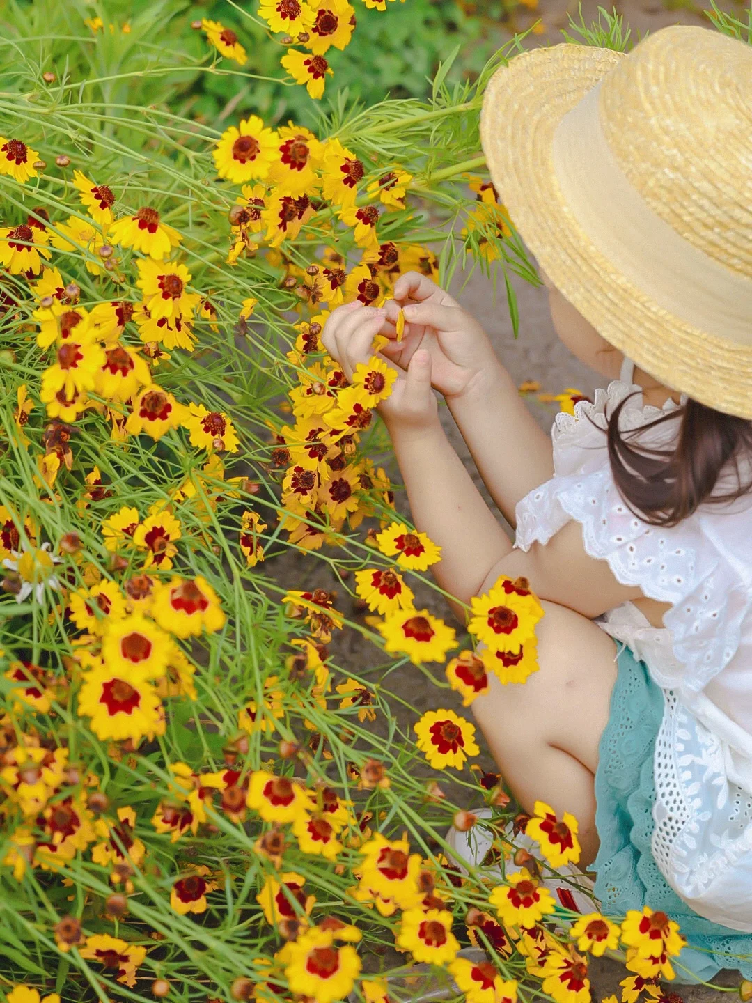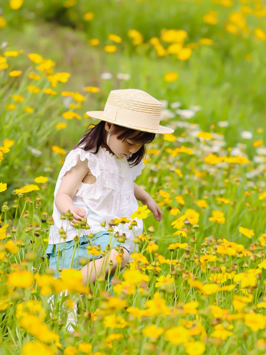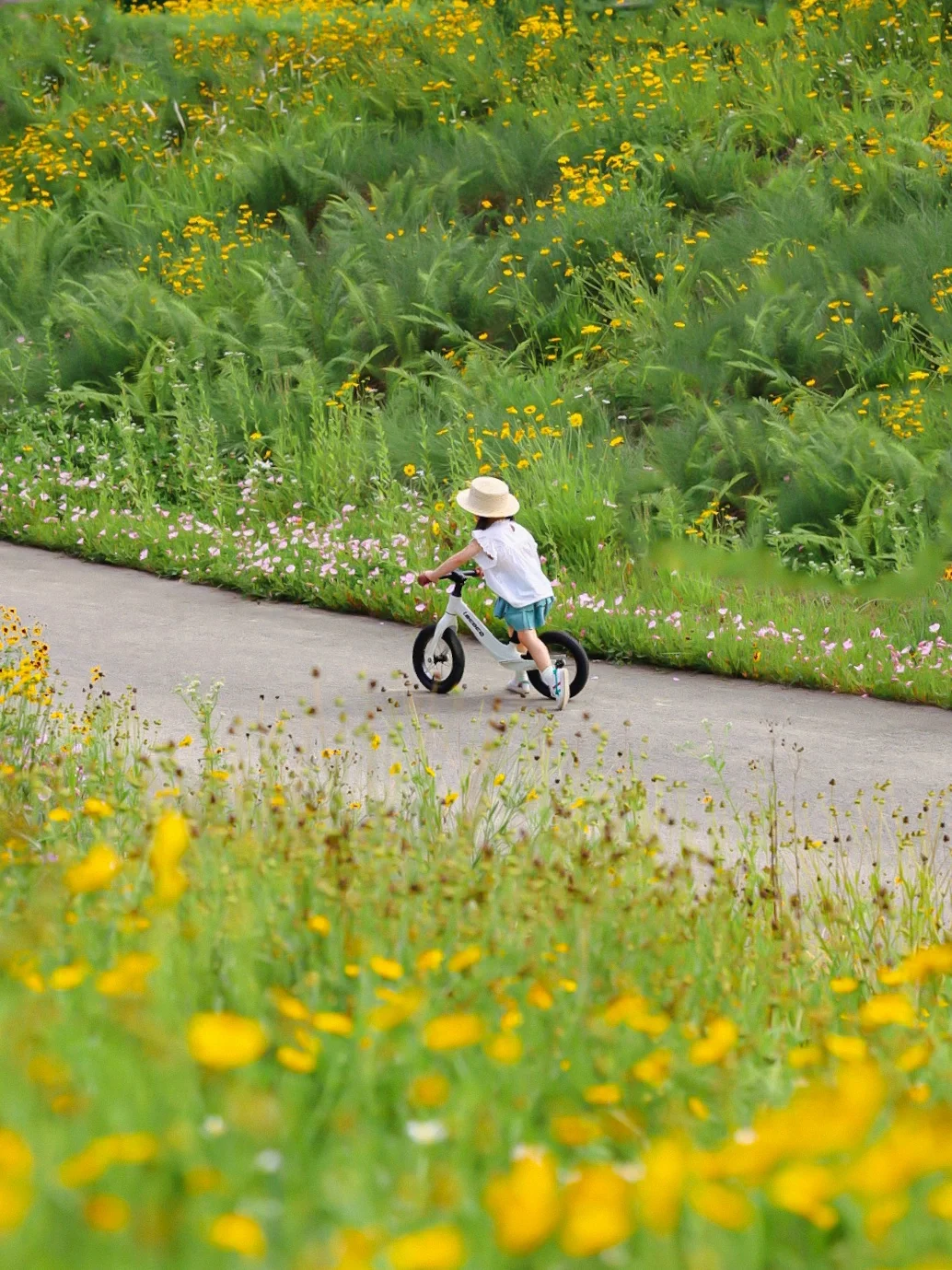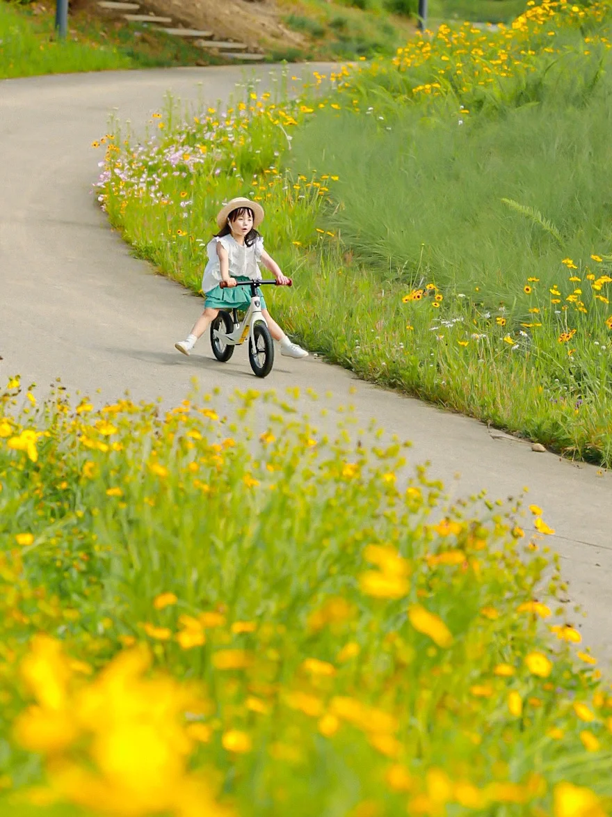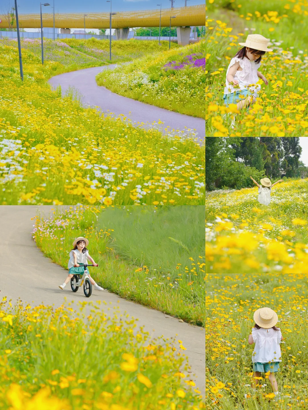 1⃣️一条蜿蜒的小路,两旁全是金灿灿的金鸡菊花海,摄影师可以站在高处俯拍孩子在小路上骑车或者奔跑的画面,人和景色融合在一起,真的随便拍都特好看