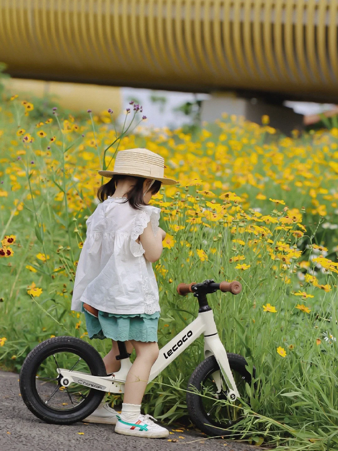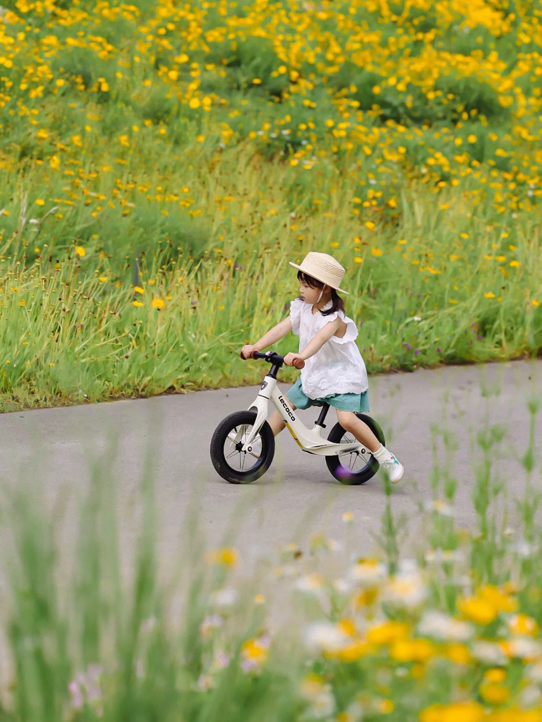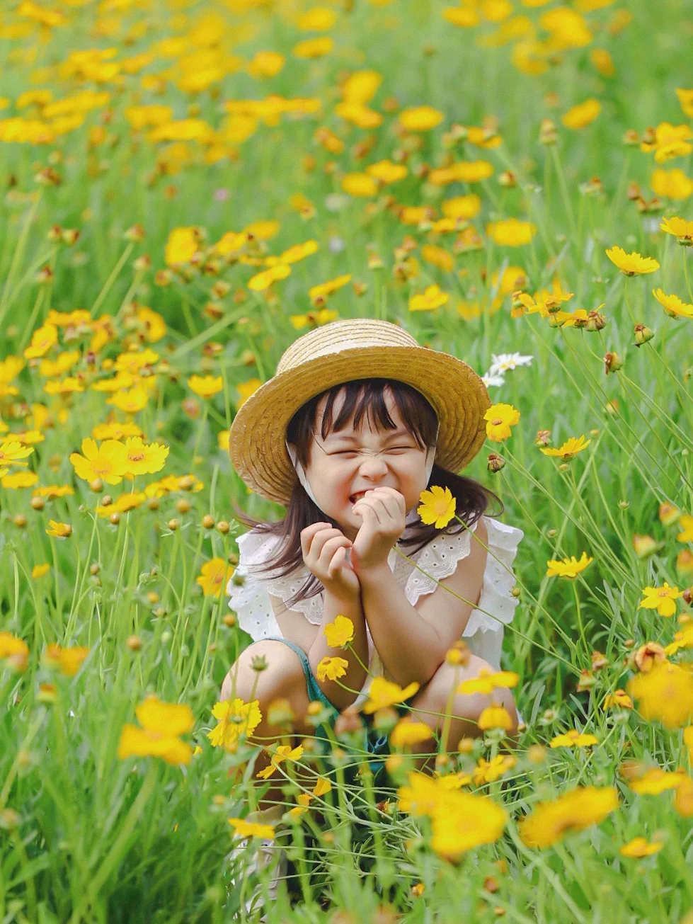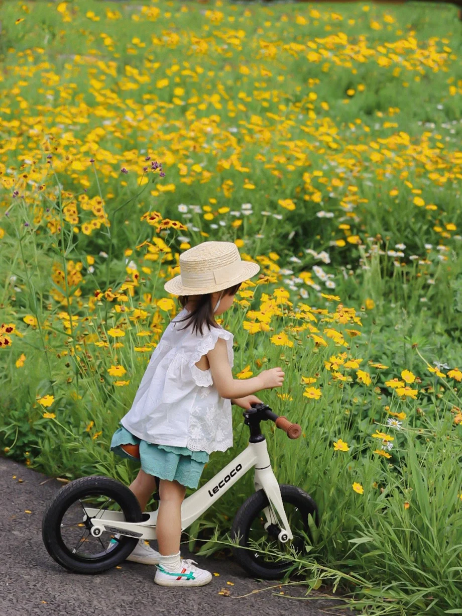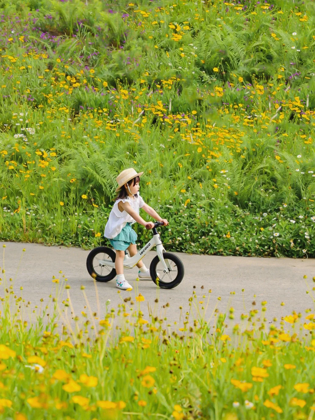 1⃣️一条蜿蜒的小路,两旁全是金灿灿的金鸡菊花海,摄影师可以站在高处俯拍孩子在小路上骑车或者奔跑的画面,人和景色融合在一起,真的随便拍都特好看