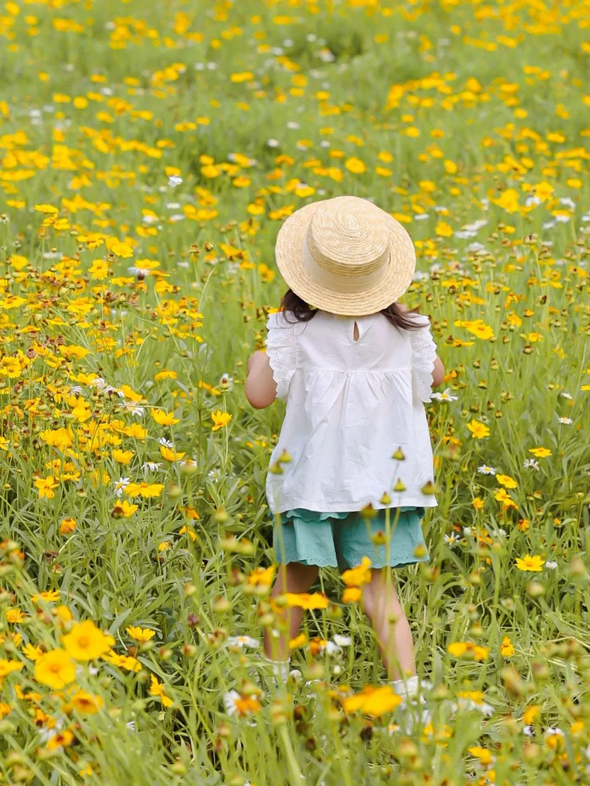 2⃣️孩子走进花海中,摄影师站在下面往上拍出一整个山坡都是黄色小花花的景象,实在太美啦