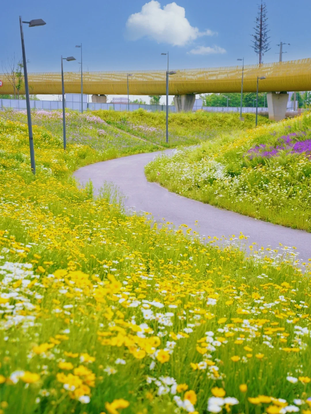 4⃣️公园除了金鸡菊花,还有月见草,蓝花楹,还有大片的芦苇丛,欧式的小白房子等,无论什么风格都能在这个公园拍到,而且还可以带孩子来公园骑行,路也特别宽敞,可以随意撒欢奔跑,真的很适合遛娃