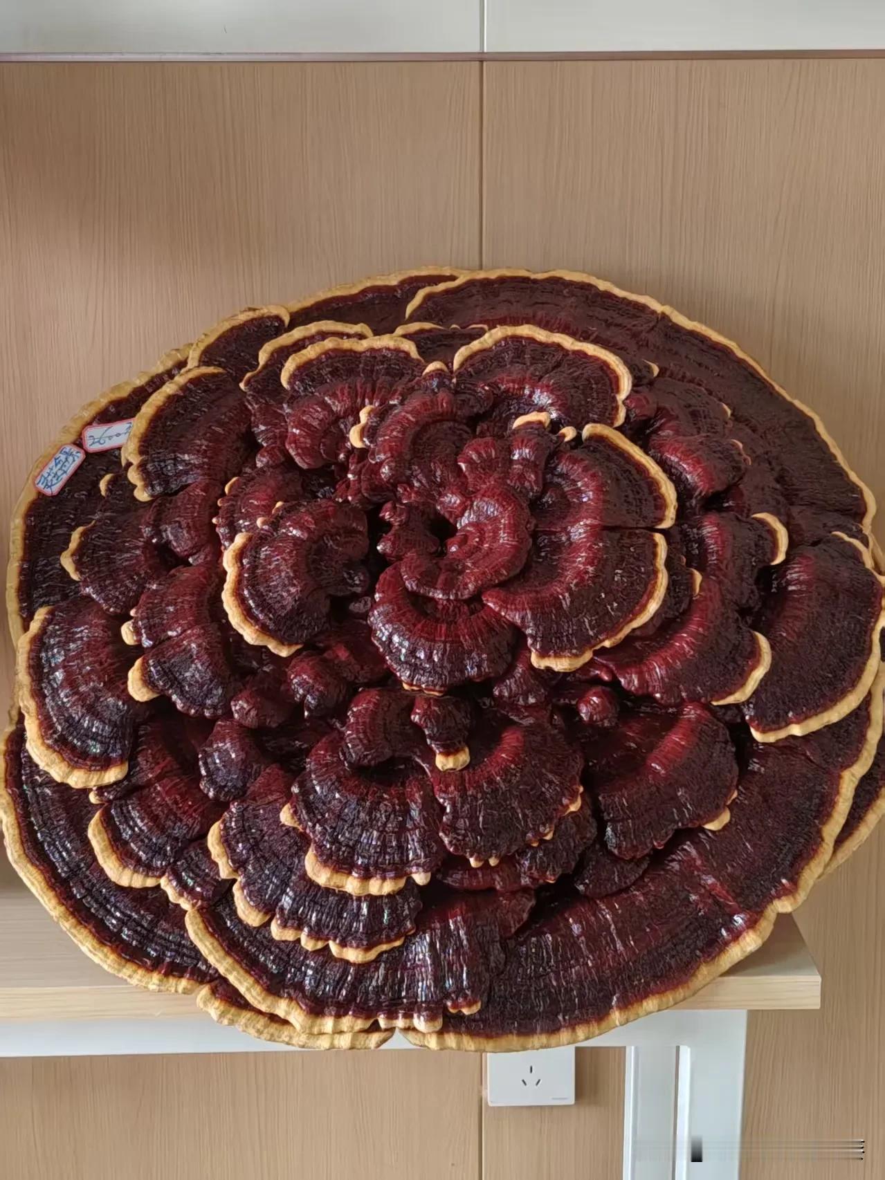 看到这朵灵芝的第一眼,我简直惊呆了。它比我想象的要大得多,层层叠叠的红色菌盖像一朵盛开的花,边缘泛着金黄色的光晕,看起来特别有光泽。 凑近细看,能发现每一片菌盖的纹理都很细腻,表面还带着一层薄薄的孢子粉。这朵灵芝摆在木质柜子前,不仅颜色搭配和谐,还透出一股浓浓的自然气息。 我忍不住想象它生长在深山老林里的样子,在潮湿的环境中慢慢长成现在这样的形态。据说灵芝在传统医学里被视为珍贵的药材,能增强免疫力、调节身体机能。 这朵灵芝不仅是自然界的艺术品,更是人类智慧的结晶。它让我对自然的神奇力量有了更深的敬畏,也让我对传统医学产生了更多的兴趣。