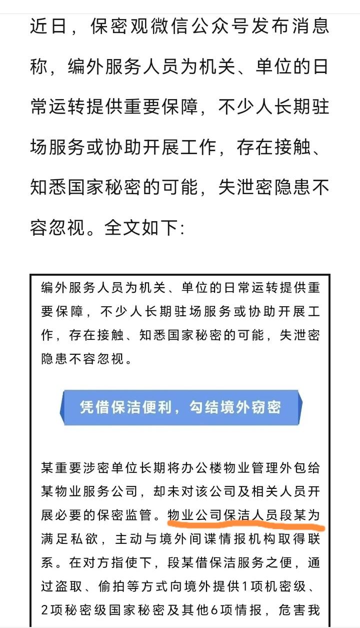 你绝对想不到,保洁员竟然是间谍!这个细节太吓人! 最近,国家安全部门披露了一起真实案件:某重要涉密单位的保洁员段某,为了满足私欲,竟然主动与境外间谍勾结,心甘情愿地一步步沦为窃密工具! 段某平时看起来就是普通保洁员,打扫卫生、清理垃圾,谁也没多留意。可偏偏,她利用工作之便,在别人不注意时偷拍、盗取了不少国家秘密文件,就为换取一点“好处费”。目前,她因间谍罪被法律严惩,但这件事给我们所有人敲响了警钟。 很多人觉得,间谍离自己很远,可段某的案件恰恰说明:保密无小事,安全防线往往毁于细节。保洁、物业、后勤等岗位,平时进出敏感区域不受太多限制,一旦被利用,后果不堪设想! 国家安全,人人有责。别让一时的疏忽或贪念,成了损害国家利益的缺口。从段某的案件中汲取教训,一起筑牢保密的防火墙! 请转发,让更多人看到,提高警惕,共同守护国家安全!当发现有间谍你会报警吗 间谍 国家安全