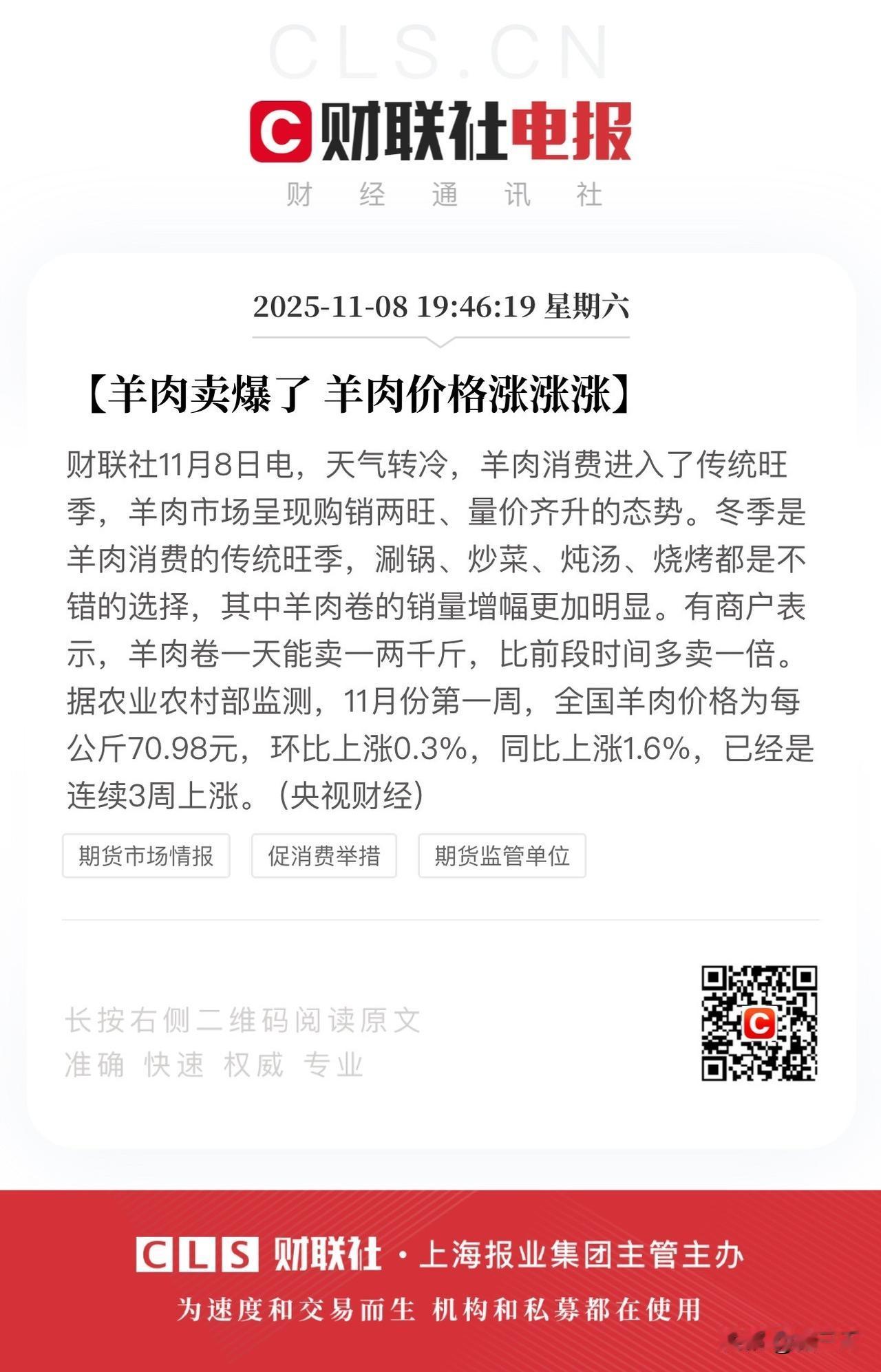 今年的羊肉要吃不起了吗? 入冬羊肉消费进入阶段小高峰, 均价已经突破70元/公斤。 南方市场偏爱山羊区别于“草羊”, 山羊更是达到80-90元/公斤。 去年这个时候, 羊牛肉都在大促销, “草羊”现宰现卖52-55元/公斤。 价格复苏是好事, 牛羊肉代表“小资情调”、中产消费, 说明社会消费力在回升, 新消费有望在跨年行情中继续领涨, 火锅料龙头安井食品、酱油千禾味业、休闲零食万辰集团&盐津铺子&有友食品,特别是泡椒凤爪有友食品进入山姆会员店本身就是消费力提升! …
