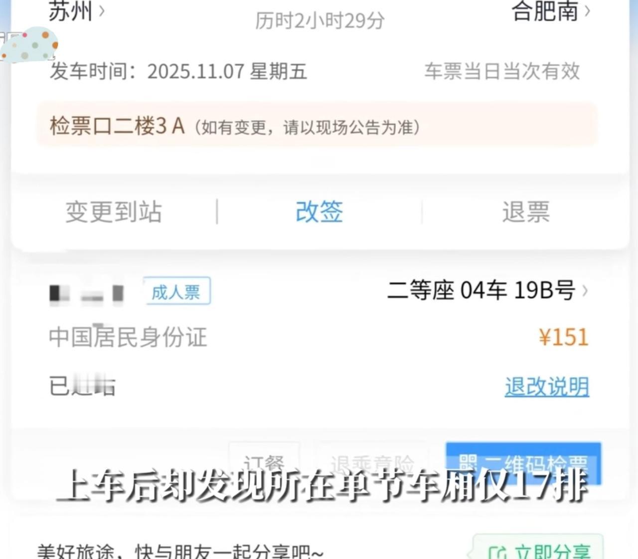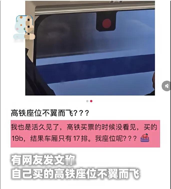 12306算法全球第一 但车厢拉垮了 近日,一名网友乘坐高铁时遇到了离谱情况:他自己买到的高铁车票,票面显示座位为19排,但上车后却发现所在车厢根本没有19排,而最多只有17排。后来这名网友致电12306客服,称一旦座位信息有变动,会以短信形式告知。据这名网友说,他并未收到相关短信 太奇葩了,大家坐高铁动车有遇到过吗,对这事儿怎么看呢?欢迎发表评论 .