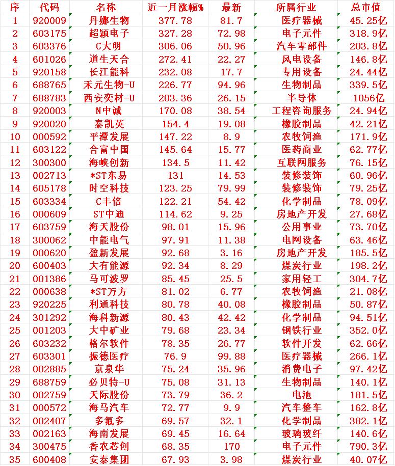 近一个月,整个市场“涨幅最强”的35名单一览! 丹娜生物:近一月涨幅 +377.78%,最新价 81.70元 超颖电子:近一月涨幅 +327.28%,最新价 72.98元 C大明:近一月涨幅 +306.06%,最新价 50.96元 道生天合:近一月涨幅 +272.41%,最新价 22.27元 长江能科:近一月涨幅 +232.08%,最新价 17.70元 禾元生物-U:近一月涨幅 +226.77%,最新价 94.96元 西安奕材-U:近一月涨幅 +203.36%,最新价 26.15元 N中诚:近一月涨幅 +170.08%,最新价 38.54元 泰凯英:近一月涨幅 +154.40%,最新价 19.08元 平潭发展:近一月涨幅 +147.22%,最新价 8.90元