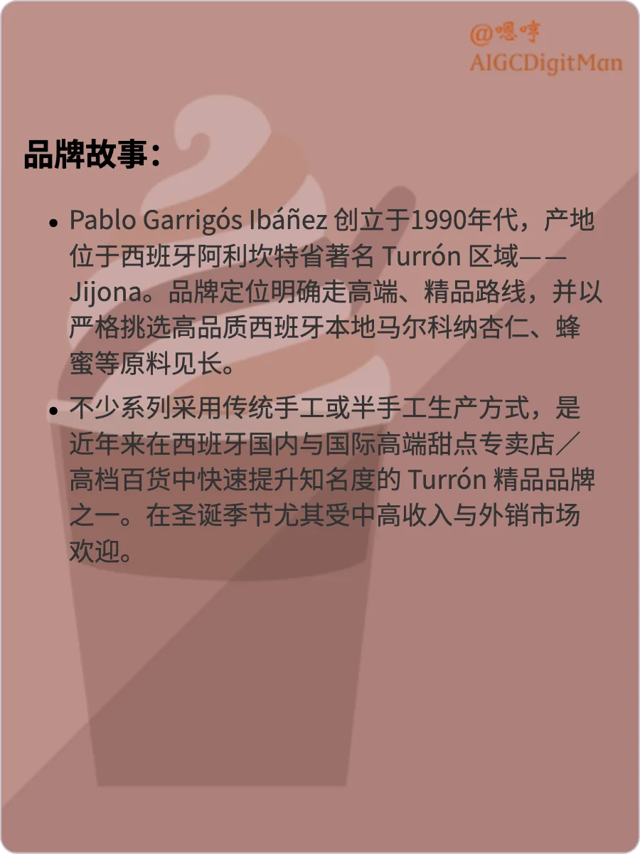 不少系列采用传统手工或半手工生产方式,是近年来在西班牙国内与国际高端甜点专卖店/高档百货中快速提升知名度的 Turrón 精品品牌之一。