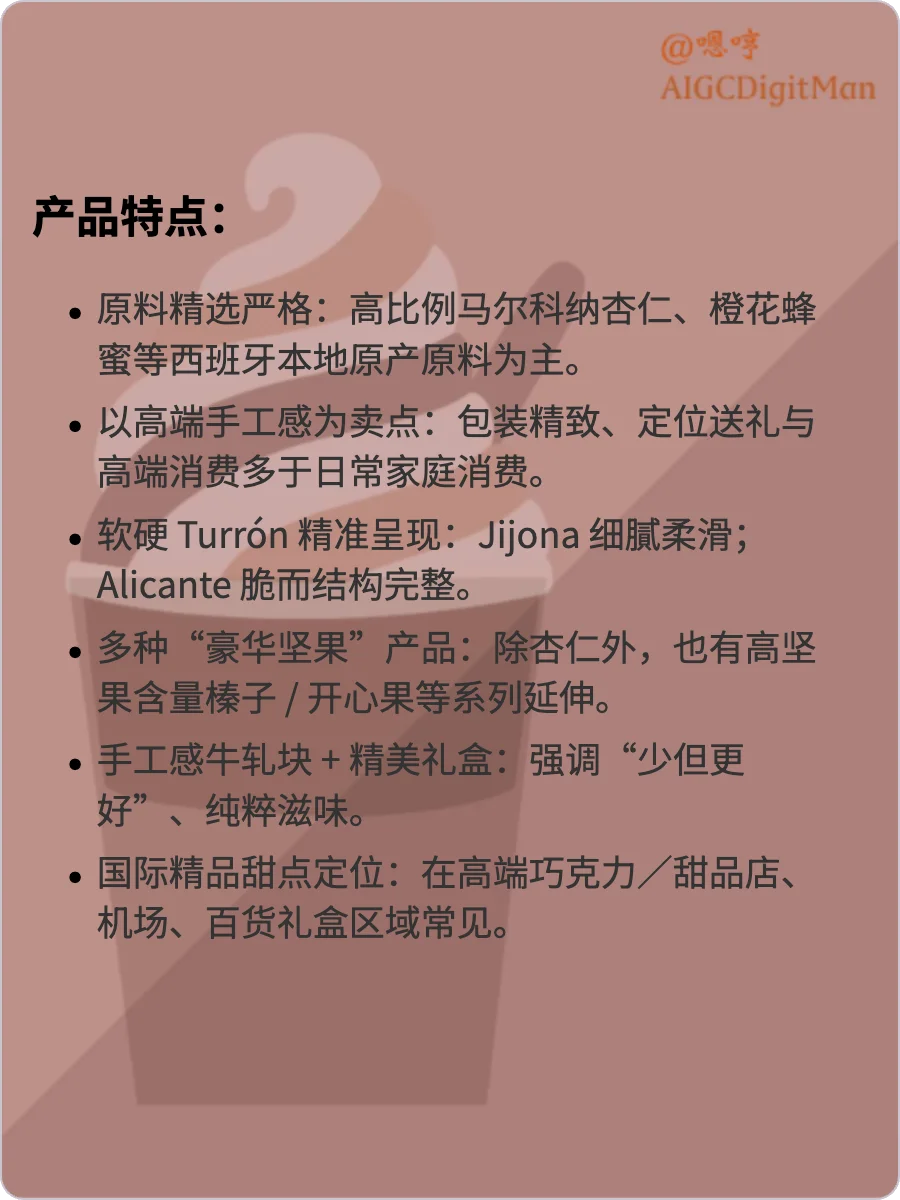 品牌定位明确走高端、精品路线,并以严格挑选高品质西班牙本地马尔科纳杏仁、蜂蜜等原料见长。