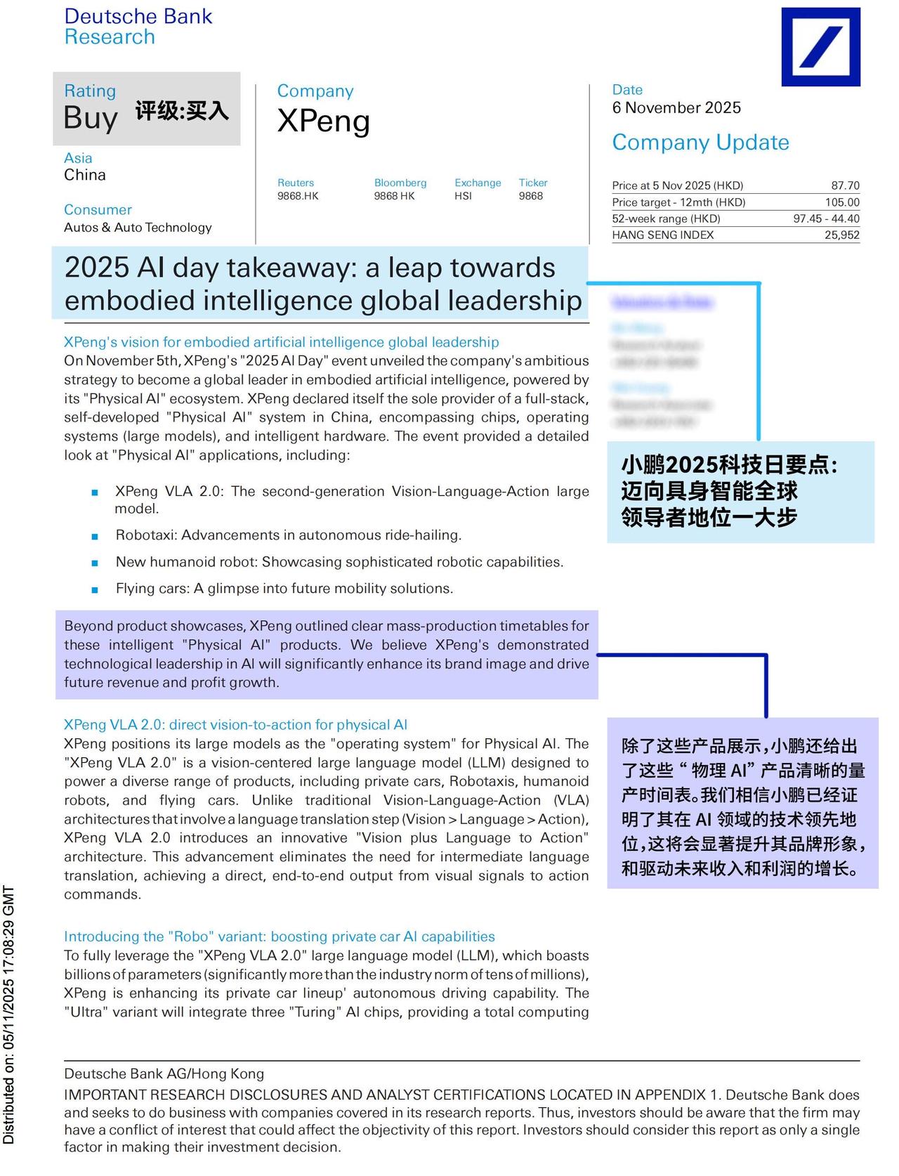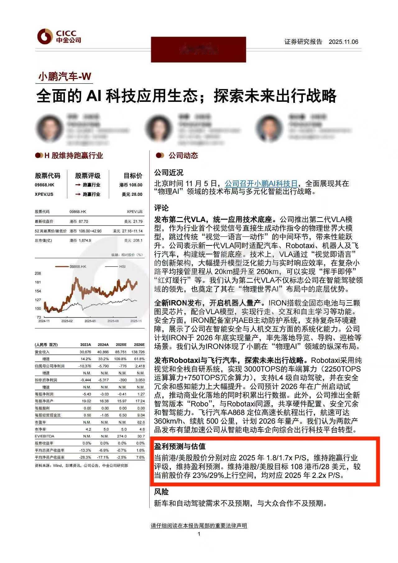 “女机器人”RION让小鹏科技日火爆出圈!引起一众网友热议。 与此同时,大摩中金等中外头部券商强推小鹏。摩根士丹利对小鹏汽车评级为“增持”,目标价设为“30美元”;德意志银行在报告中称“小鹏汽车迈向具身智能全球领导者地位一大步”,并给出“买入评级”;中金在报告中给出小鹏汽车“维持跑赢行业”评级,同时维持港股/美股目标 108 港币/28 美元。