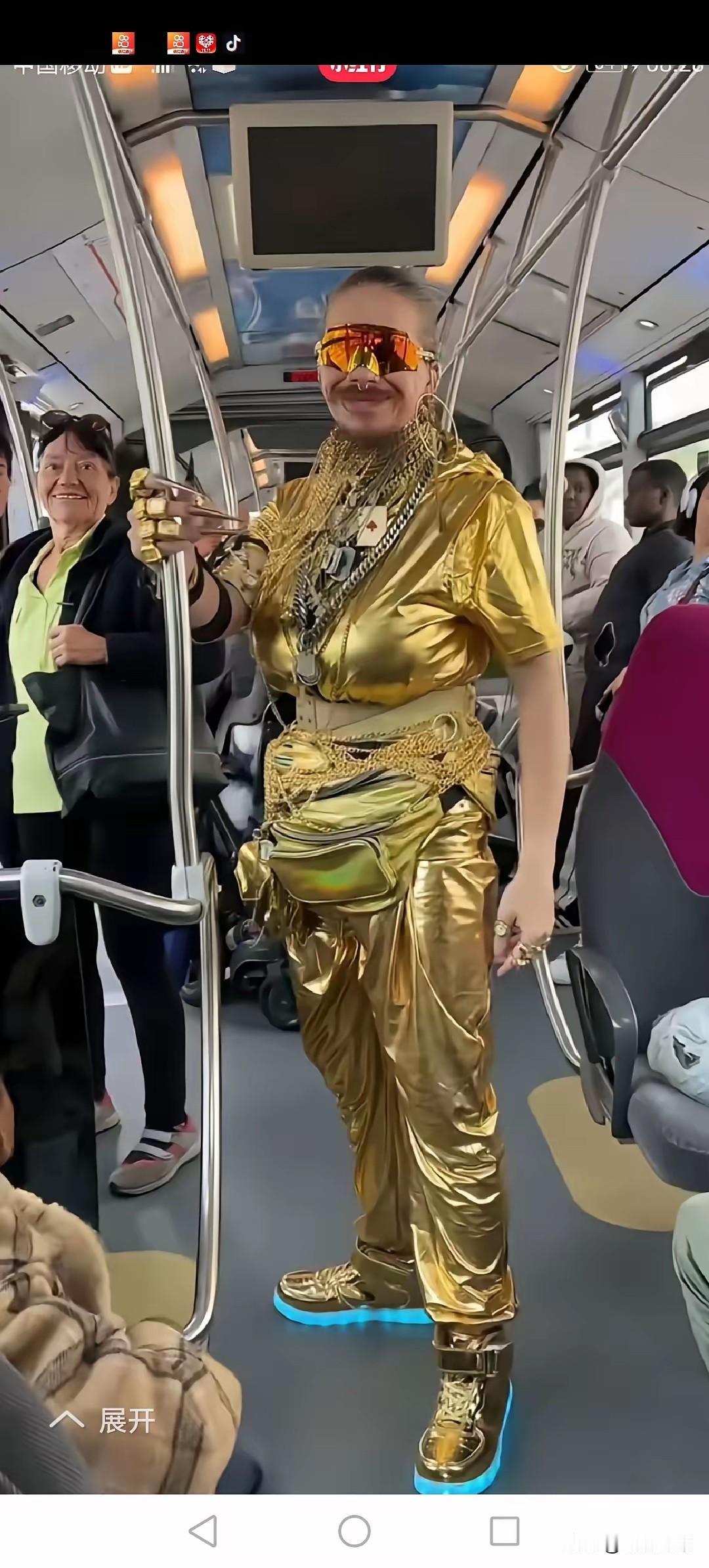 地铁上面穿着一身金色衣服这个人,太难分辨了。他到底是男人?还是女人?看他的手和胸部像是女人,看他的脸,还有胡子又像是男人,我是分辨不清这个人是男还是女了。请大家来看看他是男还是女?