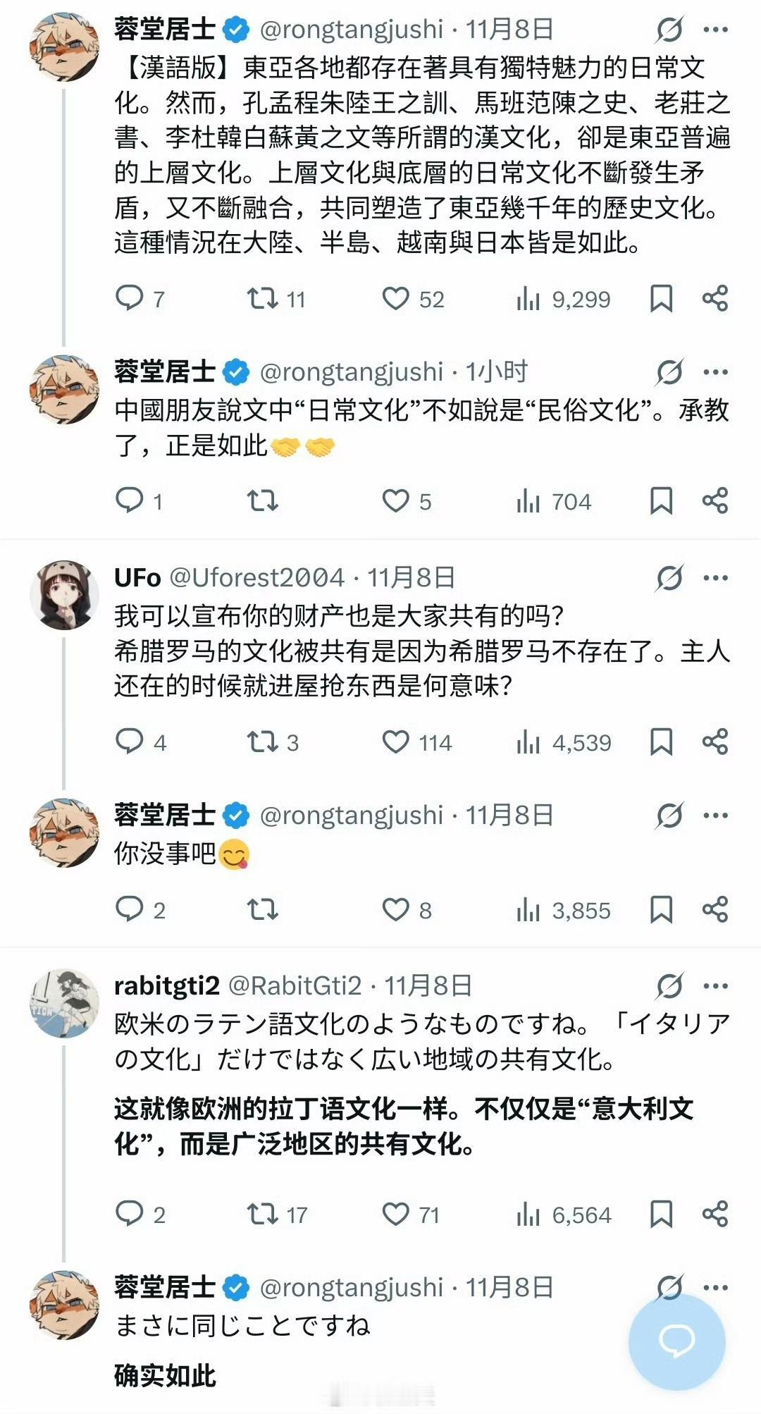 这个叫“蓉堂居士”的日本网友很有意思,通过赞美杜甫、李白以及孔孟之道,把这些中国文化的圣人塑造成东亚文化的典范,然后定义为东亚文化共同的财富,达到给日本文化贴金的目的。有意思,有意思。既然文化上承认中国的文坛圣人,那是不是应该承认一下以前中日之间的朝贡历史呢?