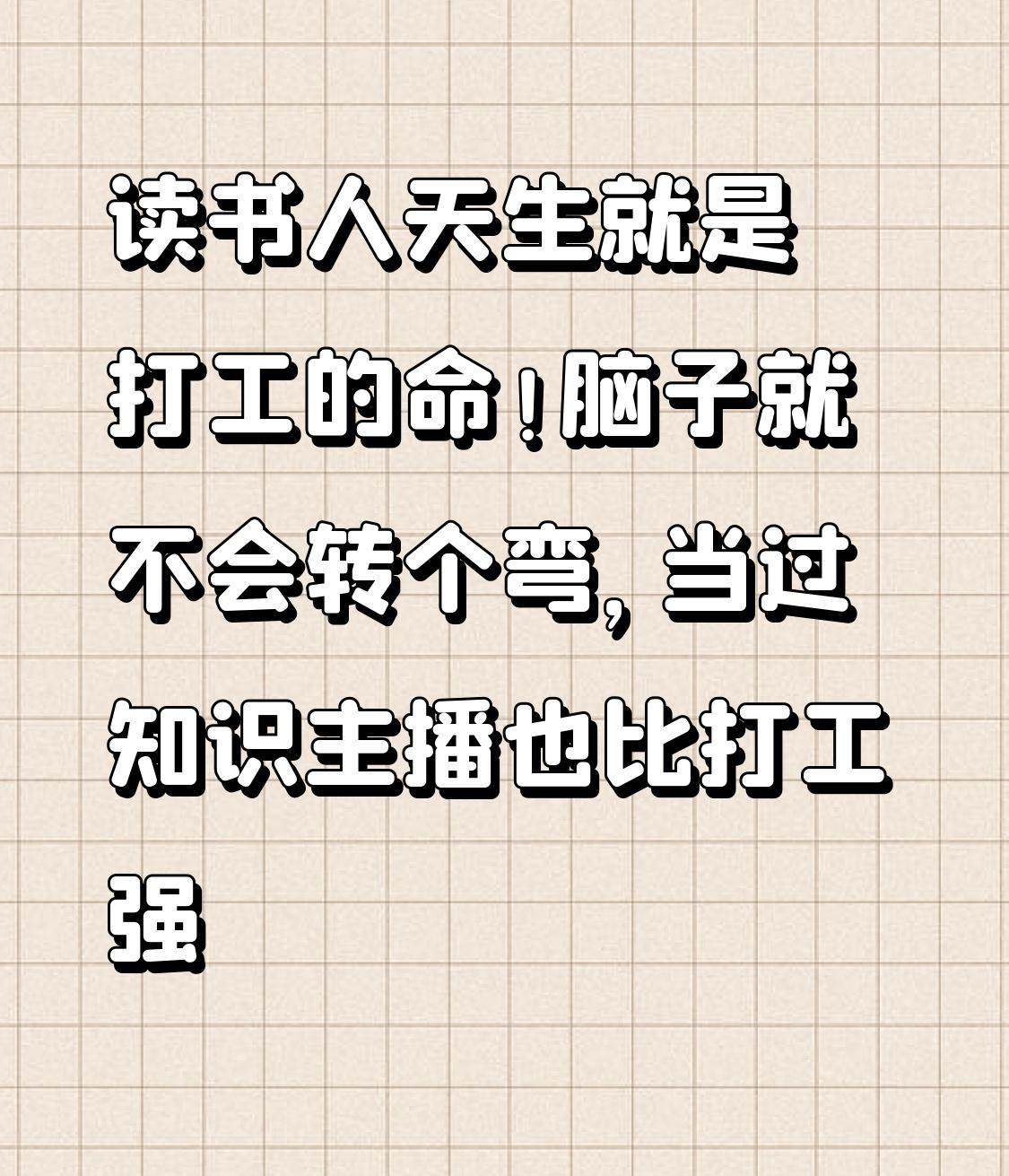 常听人说“读书人天生就是打工的命”,想想还真有点道理。很多读书时的学霸,进职场后却不太顺,反而是成绩普通的同学混得不错。这是因为学校和社会的规则不同。学校像“打地鼠”,考点清晰、回报确定,核心是精准记忆和快速解题;社会则像“经营农场”,规则模糊、回报不确定,更需要识人断物、协作共赢和把握时机的能力。 其实读书人换个思路,当知识主播就挺好。不用局限于传统打工模式,把知识分享出去,说不定天地更广阔。就像洪灝说的,做擅长的事,天地更大。