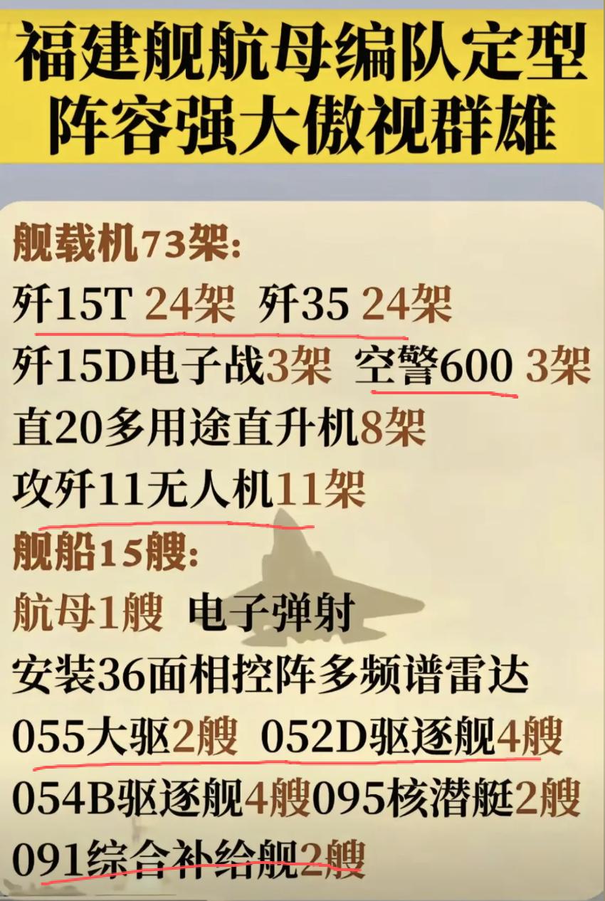 国之重器登场,南海局势将定!福建号航母入编时间点恰到好处,并且航母打击群将部署在南海,这里面的信息量很大!福建号航母入编选择在南海局势比较紧张的时候入编,一方面极大加强我国在南海的军事力量部署,同时也给一些国家发出信号,依靠军事力量是威胁不了我们的。 福建号航母是我国最强的航母打击群,航母舰载机接近百架,从5代机到四代机,还有预警机空警600和无人机等;同时福建号航母是目前电磁弹射能力最强的航母,搭载了我国最先进的电磁弹射系统,航母上的雷达系统也是世界最先进的;还有更加的战斗力,2艘055大驱护航,052D驱逐舰4艘,052B驱逐舰4艘,和潜艇2艘,战斗的垂直单元达到800多个,这样的火力配置堪称世界顶级! 近期在美国怂恿下,菲律宾、日本、澳大利亚、加拿大等国都来南海搅局,要在我国固有的领土上搅局,也要看福建号航母打击群是否答应,福建号一出南海局势无忧!加上我国在南海部署其他路基和海基军事力量,南海局势将定!