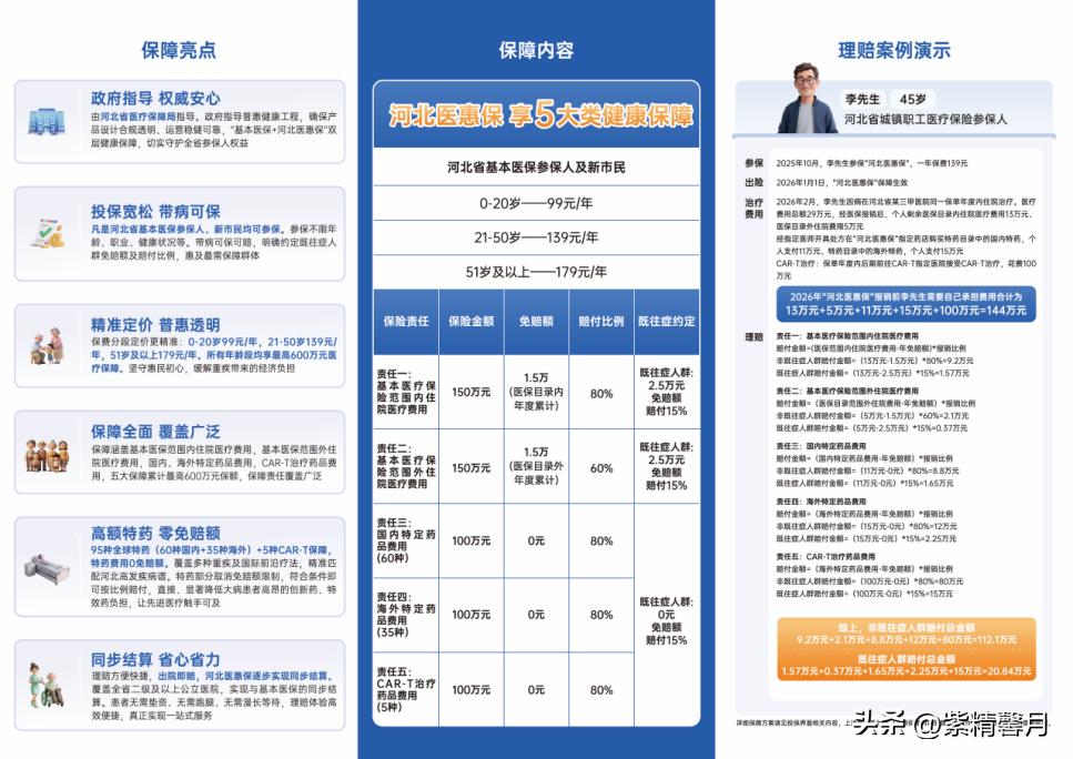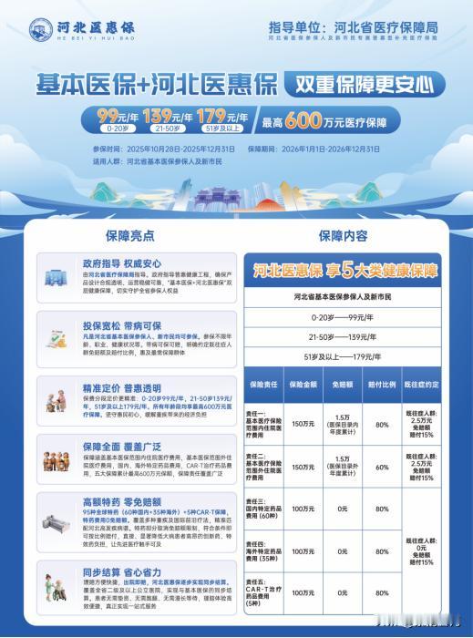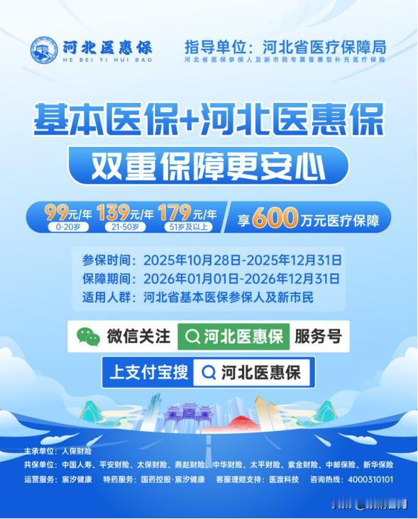 小区群总聊的河北医惠保,石家庄人先了解这些 最近小区群里天天有人聊惠民保险,身边同事也老问起这事儿,我索性翻了翻河北医惠保的公开信息,今天就随口跟大家念叨念叨,给有参保需求的朋友当个实在参考~ 河北医惠保是河北省医疗保障局指导推出的普惠型商业保险,能跟咱们的基本医保衔接上,还有好几家保险公司一起参与承保。它的保障条款、赔付规则这些都有明确公示,网上一搜就能查到详细内容,不用瞎猜瞎琢磨。 参保门槛挺贴心,河北省内的基本医保参保人、在河北长期生活的新市民都能办。不限年龄,上到百岁老人下到刚出生的娃娃都行;不限职业,上班族、个体户、自由职业者啥的都没问题;更不限制健康状况,就算有既往病史也能参保,相关的赔付要求都写得明明白白,能减少后续不少麻烦。 保障内容覆盖得挺全,医保内、外的住院费用都包含,国内60种、海外35种特定药品费用能报,就连CAR-T治疗药品费用也在保障范围内,全年保障额度是600万。非既往症人群的医保外住院费用按60%赔付,特药没有免赔额,非既往症人群按80%赔付,这些都是条款里明确约定好的,不是我随口说的。 异地就医也不用太担心,在国内(不含港澳台)二级及以上医保定点医院就诊,符合要求的费用都能按比例赔付;而且河北省内的二级及以上公立医院,正逐步推进出院即结算服务,到时候不用自己先垫钱,也不用额外提交一堆医疗票据,确实挺方便的。 主要是参保之后还能享受18项健康管理服务,像健康资讯推送、体检折扣、重疾绿通、专家二诊协助,还有京东购药9折优惠这些,参保人之后能按需选着用。 价格是按年龄段分的:0-20岁一年99元,21-50岁一年139元,51岁及以上一年179元。参保时间从2025年10月28日到12月31日,保障期从2026年1月1日开始,它有个时间节点哦。 这些都是公开可查的信息,没啥藏着掖着的。要是正在对比惠民保险,大家可以结合自己和家里的实际情况多看看,也能跟其他同类产品比比,结合自身和家庭情况多了解,给家人添份安心。