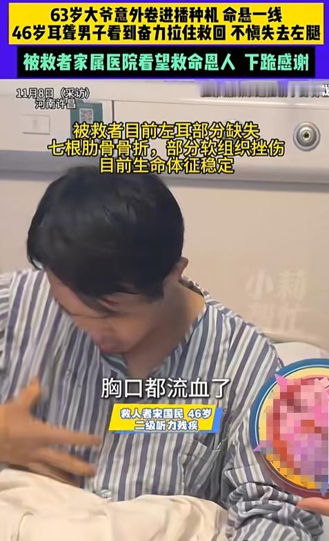 “一条腿换回一条命!”河南一残疾大哥为救深陷困境的陌生人,挺身而出。本就处在无声世界的他,如今更是雪上加霜。但他面对家属的感谢却说用自己残缺的身体,可以挽救一条生命是多么划算的一件事情!网友:太感人了,应该给大哥颁个见义勇为。 处在无声世界的他,却意外能听见生命的挣扎。 或许是天意,又或是命运让他看见这么揪心的一幕。 一天患有二级残疾的男子看见田间的播种机里面好像卷有人! 这下可把他吓坏了,赶忙跑了过去场面真是万分凶险。 机器可是认操作杆,不认人。 况且机器那么大,威力肯定也是不容小觑,稍不留神就会被卷的粉身碎骨。 但他尽管知道这些危害还是拼命展开救援。 只见老人的身子已经被卷进去大半了,他连忙拽住另半边身子拼命地往外面拉。 这一刻他是在与死神赛跑,更是在对自己不公的命运做抗争。 机器的强烈拉扯让他体力渐渐透支,头上出现了豆大般的汗水。 可他还是死死抓住那个人的身体,好不容易快要将他拉出来了。 没想到自己却因为一时不慎,导致左面的小腿被卷了进去。 那一瞬间他被一下疼的没有了知觉,但那双拉住陌生人的手还是没有松开过。 终于经过他的不懈努力,老人终于被救了出来。两人也赶紧拨打了急救电话,送去了医院治疗。 但是上天给他开了个大的玩笑,他的腿因为受伤严重必须要截肢! 众所周知,一个腿受伤萎缩后必须要尽快切掉。 不然就会伤及到别的地方,甚至危及生命就这样他又失去了自己的一条腿。 本来他的世界就已经没有了声音,如今又失去了流利行走的能力。 这对一般人来说是不小的打击,但他始终保持着乐观的心态没有怨怼。 就连伤者家属前来探望、感谢时,也说我虽然丢失了一条腿,但是换了他的命。 如果生命一定要拿些东西交换的话,那这个交易显然是划算的。 这样豁达并且善良的人,真的值得我们尊敬。 面对高速旋转的机器,他能挺身而出去救就已经超过了绝大多数人了。 明明他已经深陷残疾,根本就听不见别人的呼救。 但他还是看见了,没有逃避或许是不愿意看见一条鲜活的生命就这样没了。 又或者是不忍心看见别人跟自己一样落下残疾。 他知道这样的生活有多难熬,自己淋过雨就想要给别人撑伞。 这种平凡中的伟大,更加打动人心。 有人说英雄离我们很远,但其实他们就在我们身边不是吗? 如果面对那个情形的是我们,其实未必会那么不顾一切地冲过去救人,多少都会有些犹豫。 但他秉持着一颗炽热的心,一门心思想要把人救出来甚至连生死都置之度外了。 但是赞扬过后,我们不禁担忧起他的处境。 46岁可能正是家里的顶梁柱,孩子的学费,家里的吃穿用度可能都要指着他生活。 但现在出了这样的事情,他又该怎么样生活呢? 希望有很多人可以看见这件事情,给大哥一个好的工作机会。 让善良的人有个好的归宿! 对此大家有什么看法呢?如果生活中是你碰到你会怎么做呢?欢迎大家在评论区里留言交流。 信息来源: 河南残疾男子用一条腿换回一条命,救人者称:不后悔 生命面前一条腿算不了啥! 被救者家属下跪表示感谢 大象新闻
